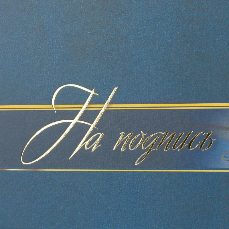 Адресная папка формата А4, синего цвета. На обложке тиснение золотистой фольгой На подпись. Предназначена для подачи документов на подпись руководителю. Материал обложки: ламинированная мелованная бумага. Внутренняя отделка: бумага офсетная, плотностью 120 г/кв.м.
