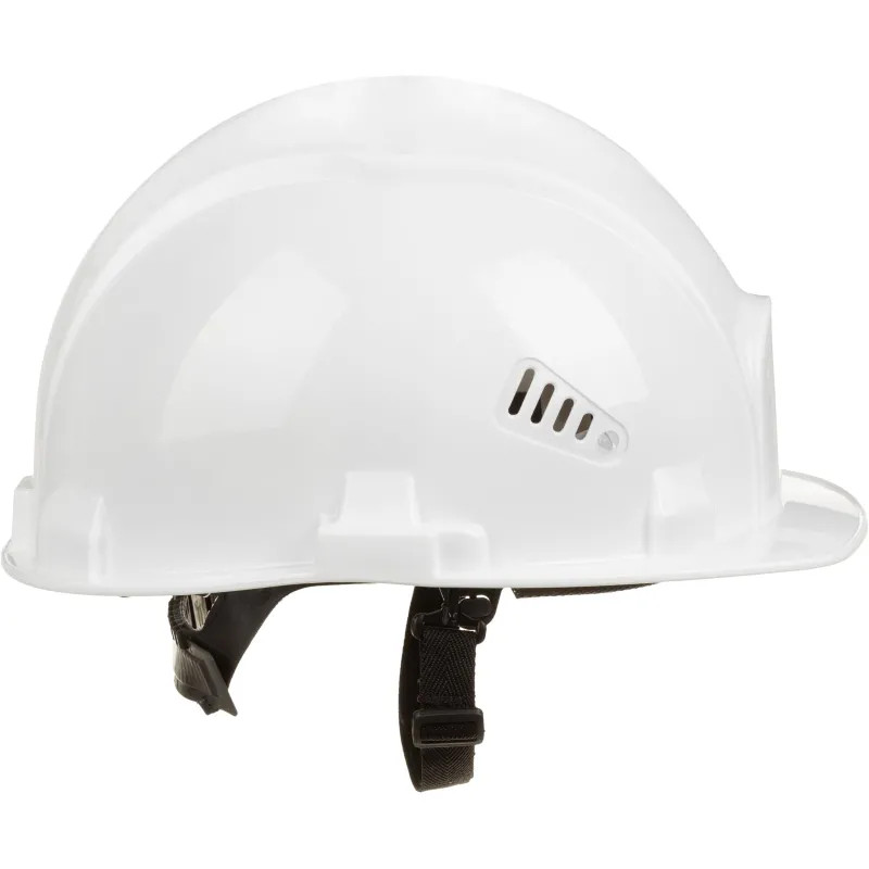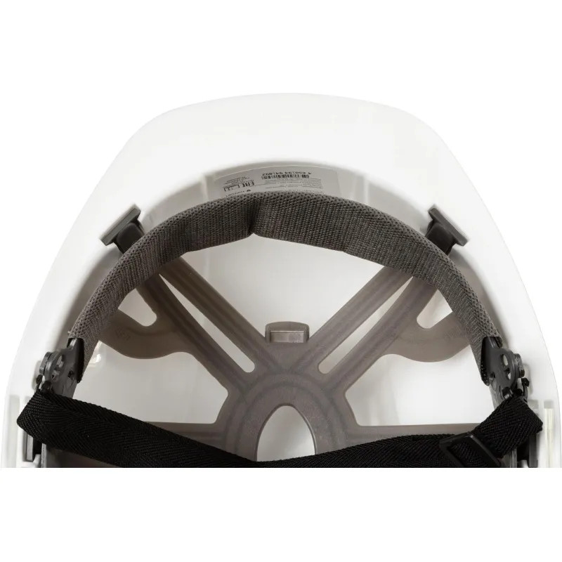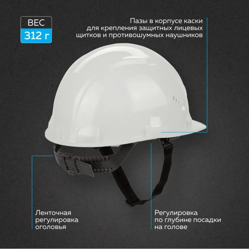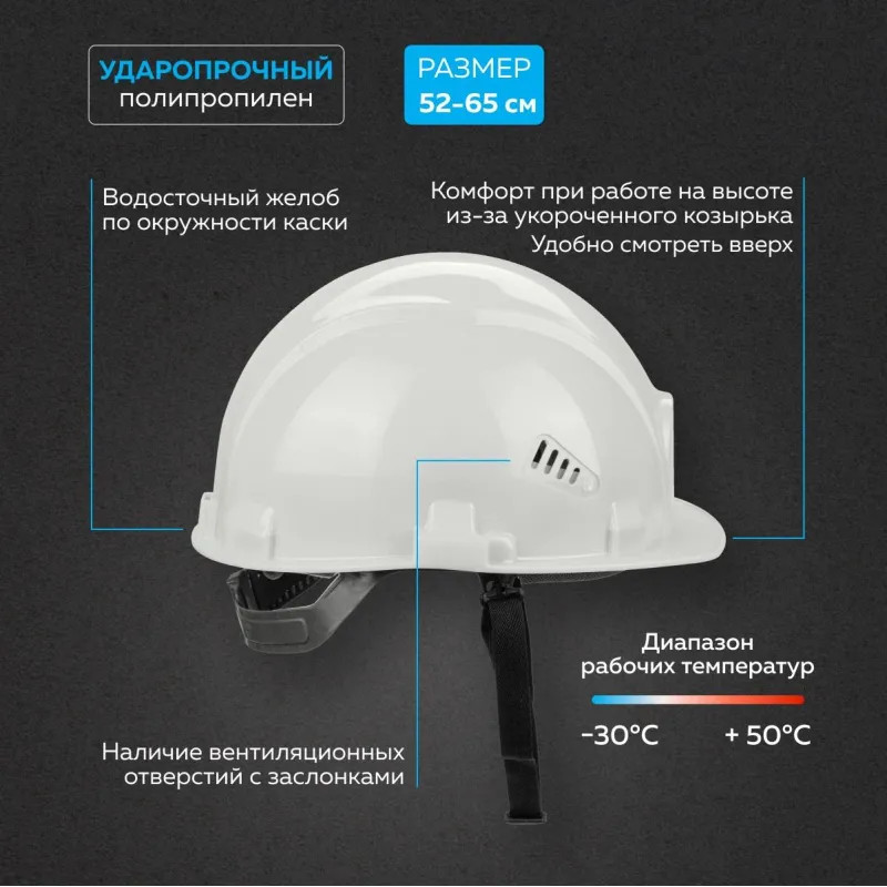 Каска защитная TOPFORT Стандарт 101 белая с ленточным механизмом общего назначения c укороченным козырьком. Пластиковая эластичная внутренняя оснастка легко моется и быстро сушится. Возможна регулировка вентиляции внутри каски с помощью заглушек. Водосточный желоб по окружности каски. Площадка для нанесения логотипа спереди.