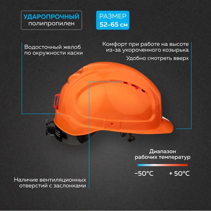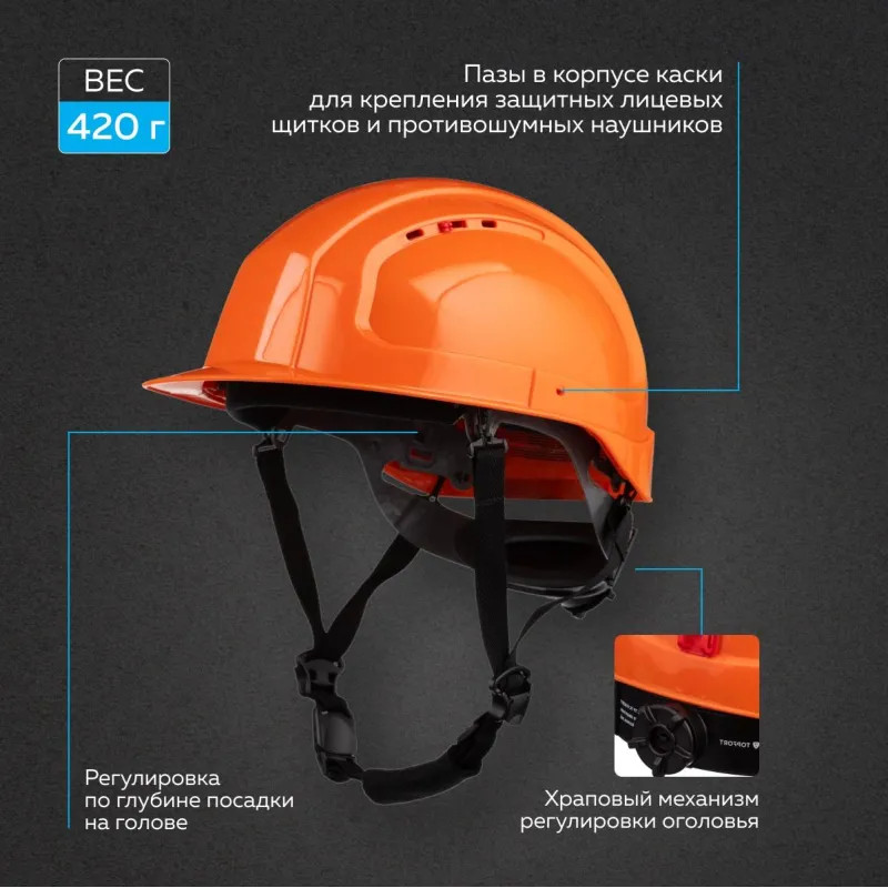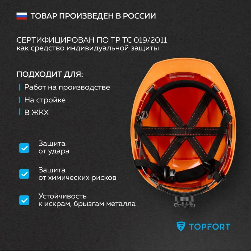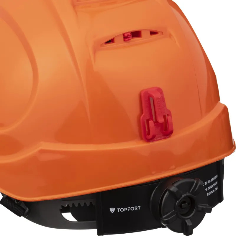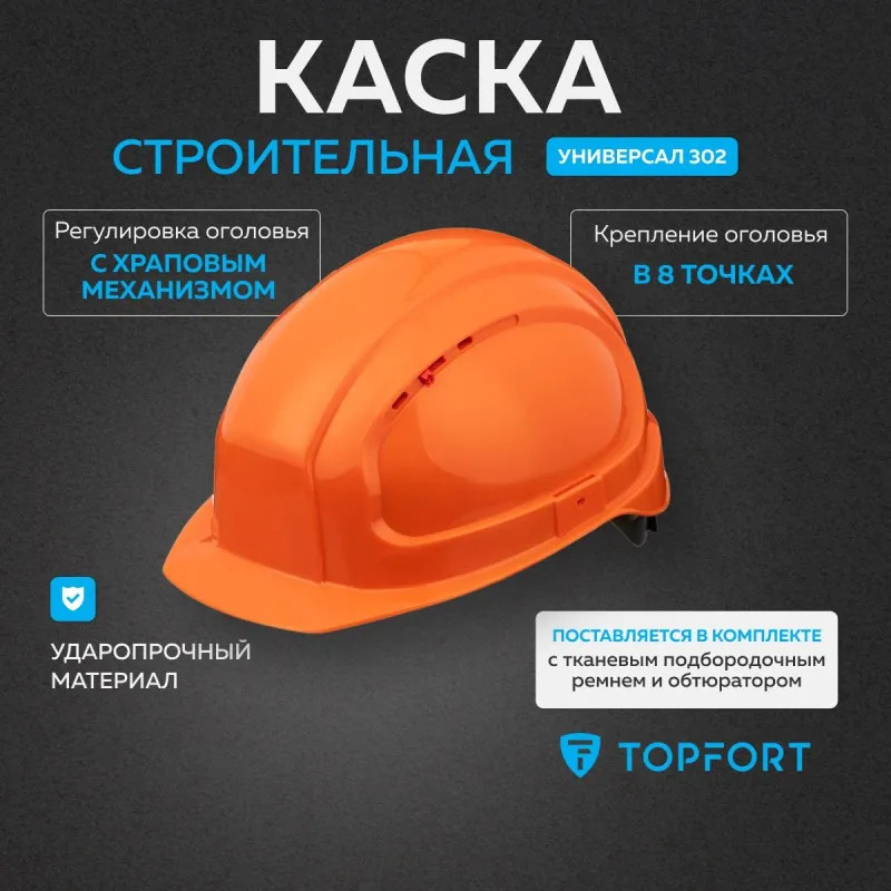 Каска защитная TOPFORT Универсал 302 оранжевая с храповым механизмом для работ на высоте с четыркехточечным подбородочным ремнем. Каска с двойным ребром жесткости, укороченным козырьком, увеличенной защитой затылочной части и храповым механизмом регулировки размера. С помощью храповика можно отрегулировать каску по размеру, не снимая ее с головы. Водосточный желоб по окружности каски. Площадка для нанесения логотипа спереди и с боков. Каска обладает тремя ступенями регулировки по глубине посадки на голове. В затылочной части каски установлен держатель для фиксации на каске наголовной ленты закрытых очков. Одновременно с этим держатель является УФ-индикатором старения каски: при воздействии УФ-лучей, цвет держателя выгорает, выцветший держатель означает, что нужно сменить каску. В корпусе каски имеются пазы для совместного ношения с защитными лицевыми щитками и противошумными наушниками. Сменная налобная лента (обтюратор) из мягкой ткани для повышения комфорта ношения. Несущая лента внутренней оснастки имеет специальные крючки в затылочной части для крепления пелерины. Поставляется в комплекте с 4х точечным текстильным подбородочным ременем, который крепится к корпусу каски при помощи карабина, регулировка по длине осуществляется при помощи пряжки, для быстрого съема каски с головы установлена застежка.
