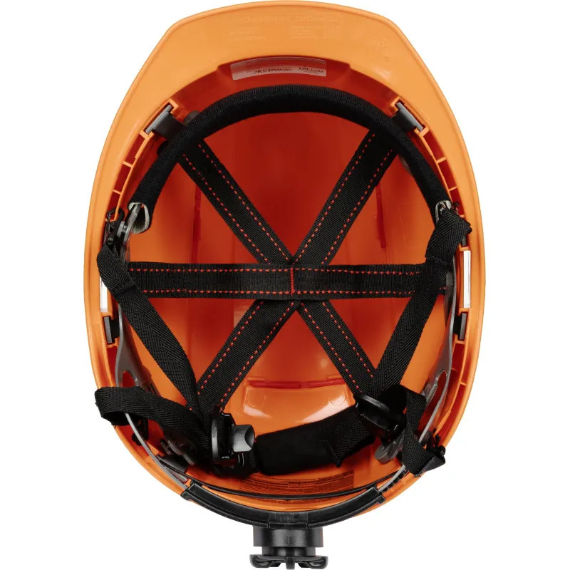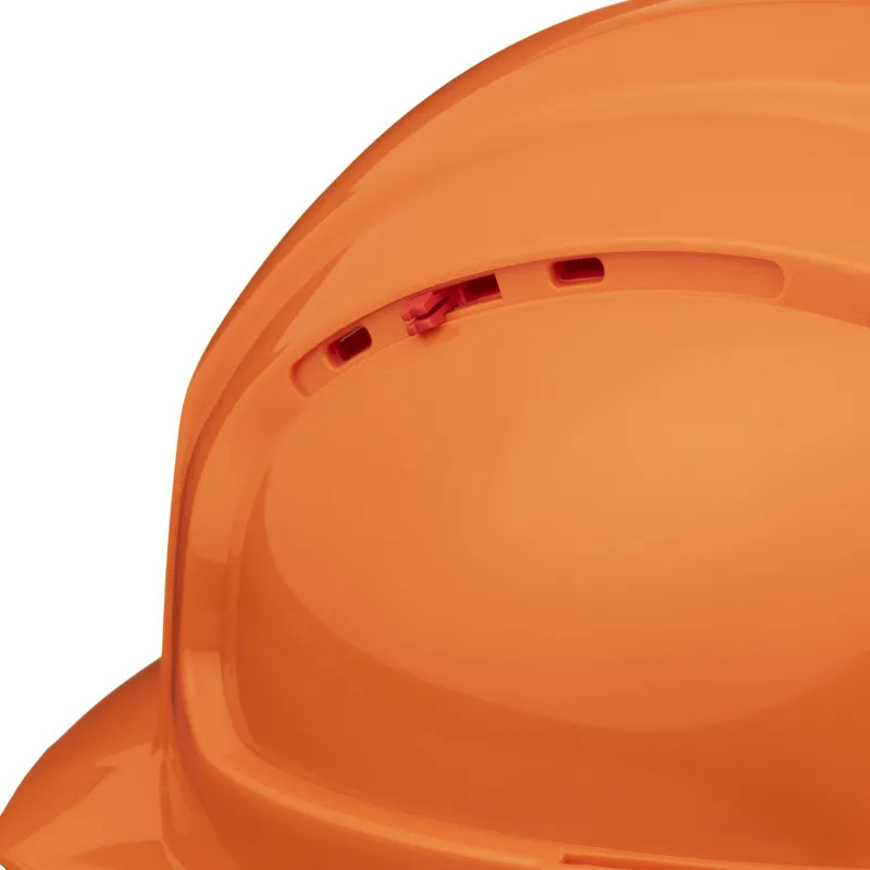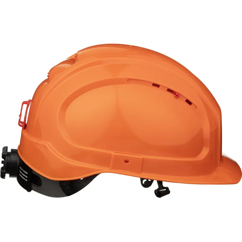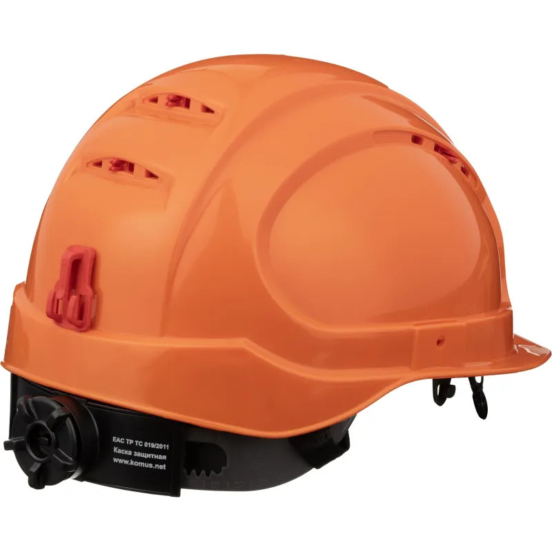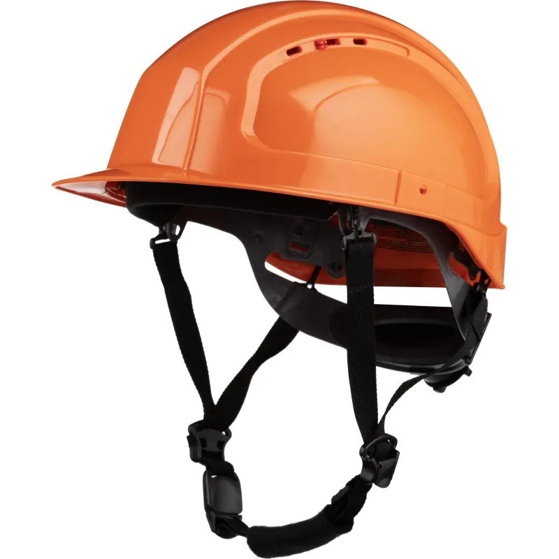 Каска защитная TOPFORT Универсал 302 оранжевая с храповым механизмом для работ на высоте с четыркехточечным подбородочным ремнем. Каска с двойным ребром жесткости, укороченным козырьком, увеличенной защитой затылочной части и храповым механизмом регулировки размера. С помощью храповика можно отрегулировать каску по размеру, не снимая ее с головы. Водосточный желоб по окружности каски. Площадка для нанесения логотипа спереди и с боков. Каска обладает тремя ступенями регулировки по глубине посадки на голове. В затылочной части каски установлен держатель для фиксации на каске наголовной ленты закрытых очков. Одновременно с этим держатель является УФ-индикатором старения каски: при воздействии УФ-лучей, цвет держателя выгорает, выцветший держатель означает, что нужно сменить каску. В корпусе каски имеются пазы для совместного ношения с защитными лицевыми щитками и противошумными наушниками. Сменная налобная лента (обтюратор) из мягкой ткани для повышения комфорта ношения. Несущая лента внутренней оснастки имеет специальные крючки в затылочной части для крепления пелерины. Поставляется в комплекте с 4х точечным текстильным подбородочным ременем, который крепится к корпусу каски при помощи карабина, регулировка по длине осуществляется при помощи пряжки, для быстрого съема каски с головы установлена застежка.