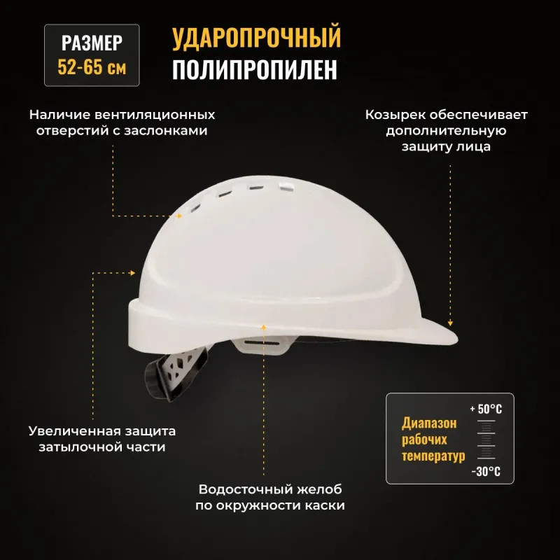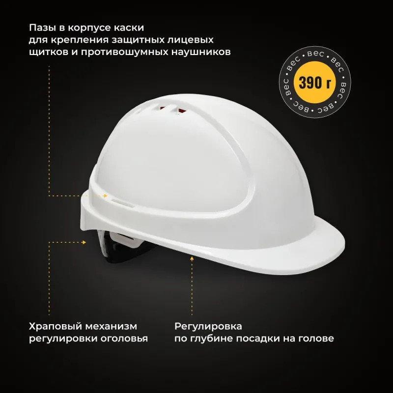 Каска комплектуется потовпитывающей вставкой из современных гипоаллергенных материалов на лобовой части оголовья и подбородочным ремнем. Боковые адаптеры позволяют крепить наушники и лицевые щитки. Укороченный козырек обеспечивает наилучший обзор. Устойчивость к боковой деформации подтверждена протоколами испытаний. На корпусе каски предусмотрена специальная площадка для нанесения фирменного логотипа. Крепление оголовья — 6 точек. Регулировка оголовья — храповик. Температурный режим эксплуатации — от ?30°C до +50°C. Вес изделия составляет 380 г. Стандарты: ТР ТС 019/2011, ГОСТ EN 397-2012.