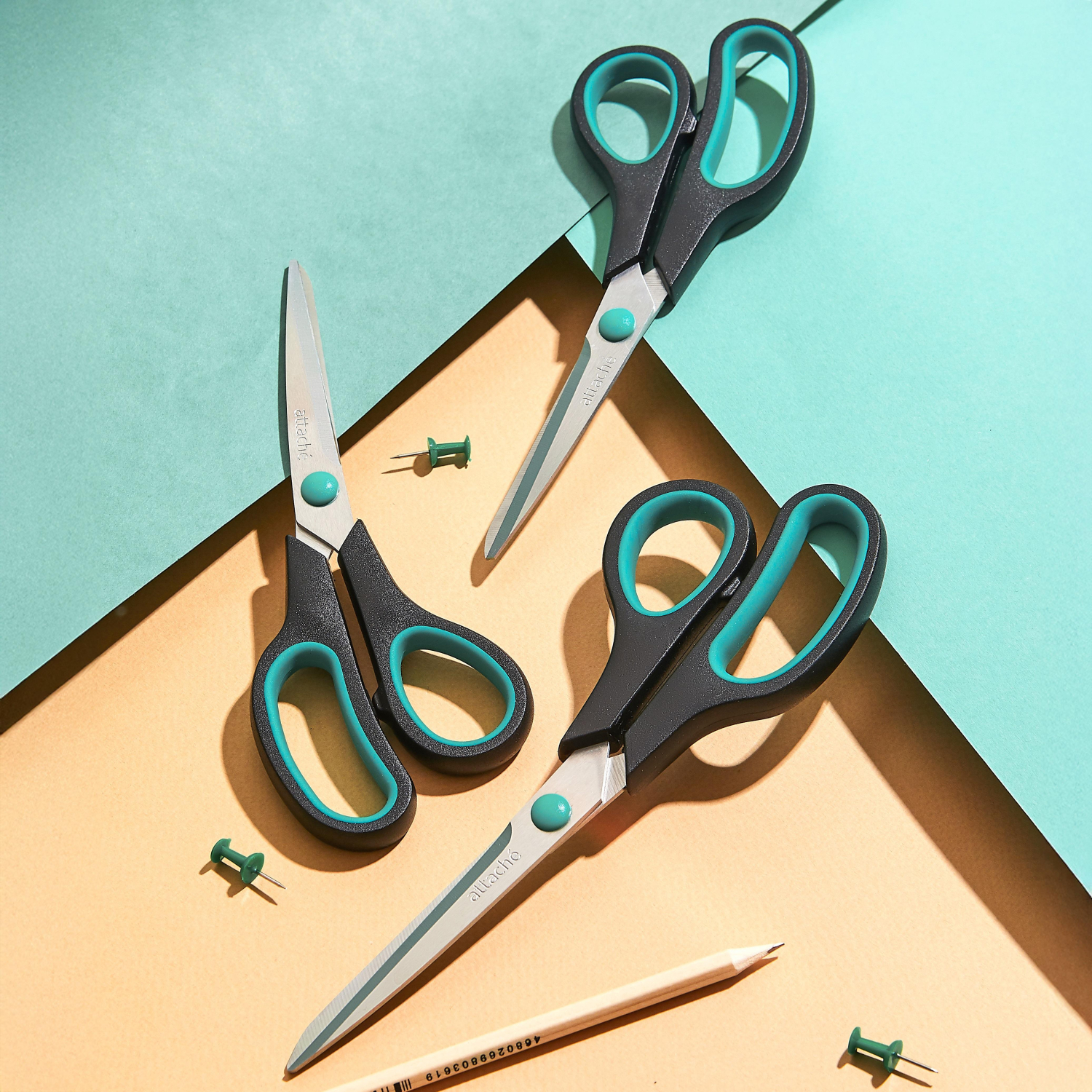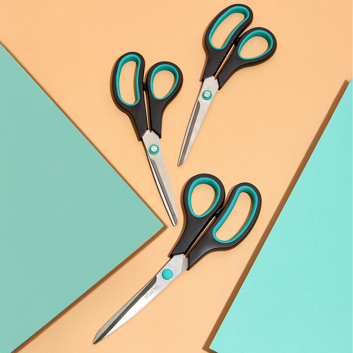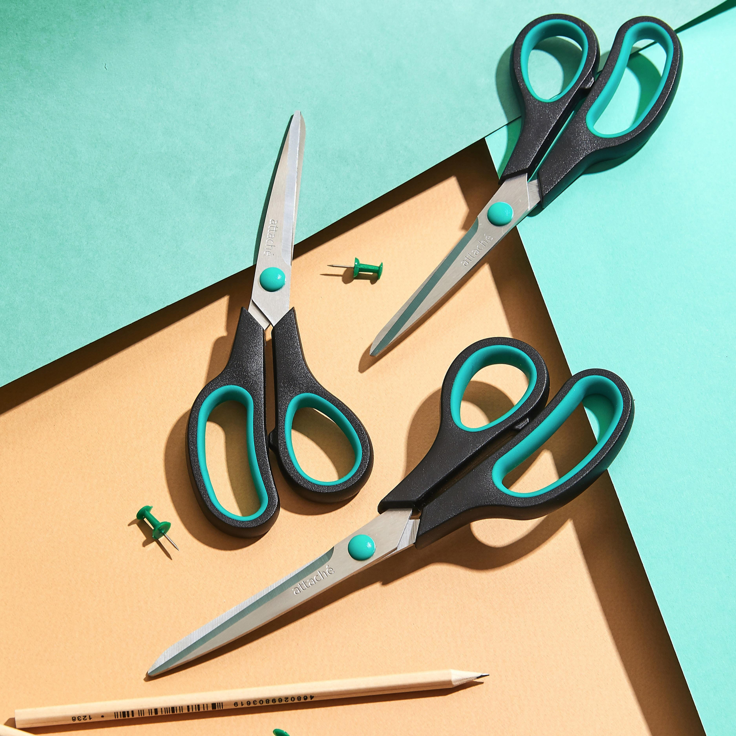 Канцелярские ножницы (офисные) Attache имеют лезвия, выполненные из стали. Для оформления ручек выбрана комбинация из двух цветов: черный и бирюзовый. Кольца анатомической формы с резиновыми вставками предотвращают скольжение пальцев. Трехсторонняя заточка лезвий. Длина ножниц - 19,5 см. Изделие поставляется упаковке на картонной подложке. Относится к сегменту &,#039,суперэконом&,#039, - товар с минимальными требованиями к качеству для тех, кто хочет сэкономить. Товар отвечает основным характеристикам.