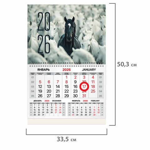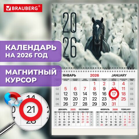 Квартальный календарь BRAUBERG "Символ 2026" предназначен для делового планирования. Офисный календарь на 2026 год на гребне. Состоит из 1 блока с календарными сетками на три месяца с магнитным курсором. Блок календаря напечатан на мелованной бумаге плотн