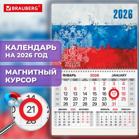 Квартальный календарь BRAUBERG "Символика" предназначен для делового планирования. Офисный календарь на 2026 год на гребне. Состоит из 1 блока с календарными сетками на три месяца с магнитным курсором. Блок календаря напечатан на мелованной бумаге плотнос