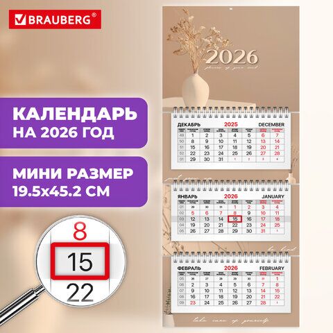 Квартальный календарь BRAUBERG EXTRA MINI "Нежность" предназначен для делового планирования. Офисный календарь на 2026 год на 3 гребнях. Для удобства планирования состоит из 3 блоков с календарными сетками на три месяца – предыдущий, текущий и следующий.