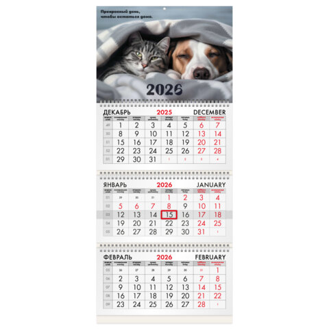 Квартальный календарь BRAUBERG "Домашние любимцы" предназначен для делового планирования. Офисный календарь на 2026 год на 3 гребнях. Состоит из 3 блоков с календарными сетками на три месяца – предыдущий, текущий и последующий. Блок календаря напечатан на