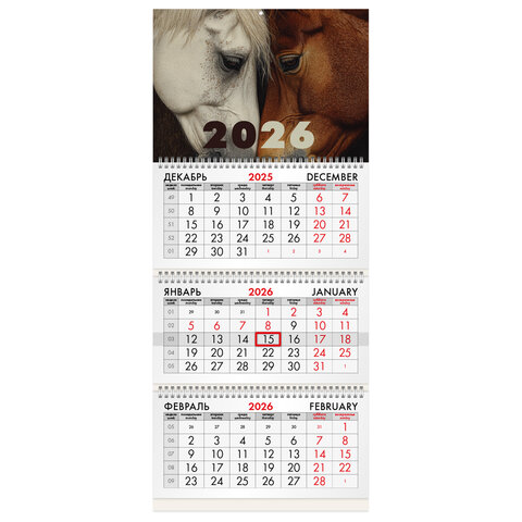 Квартальный календарь BRAUBERG "Лошади" предназначен для делового планирования. Офисный календарь на 2026 год на 3 гребнях. Для удобства планирования состоит из 3 блоков с календарными сетками на три месяца – предыдущий, текущий и следующий.