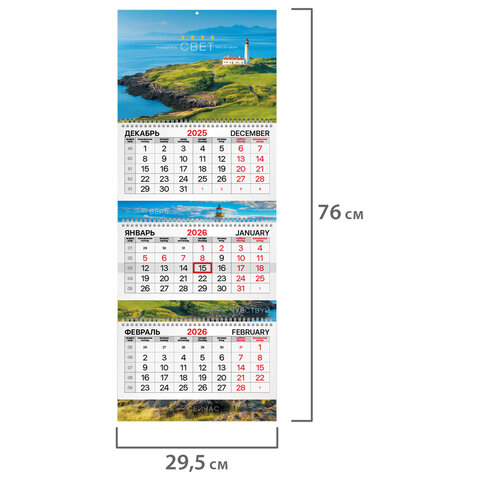 Квартальный календарь BRAUBERG EXTRA "Маяк" предназначен для делового планирования. Офисный календарь на 2026 год на 3 гребнях. Для удобства планирования состоит из 3 блоков с календарными сетками на три месяца – предыдущий, текущий и следующий. Курсор-бе