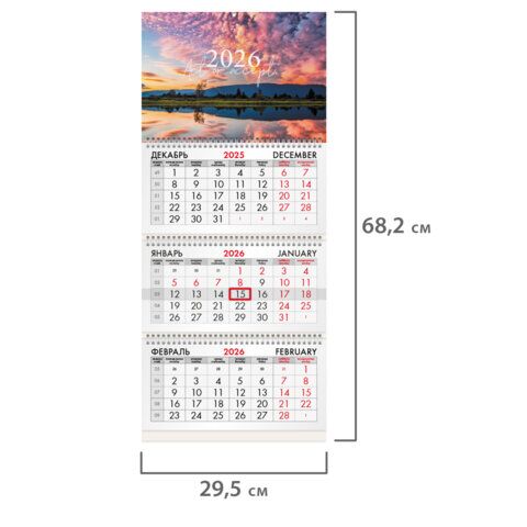 Квартальный календарь BRAUBERG "На закате" предназначен для делового планирования. Офисный календарь на 2026 год на 3 гребнях. Состоит из 3 блоков с календарными сетками на три месяца – предыдущий, текущий и последующий. Блок календаря напечатан на офсетн