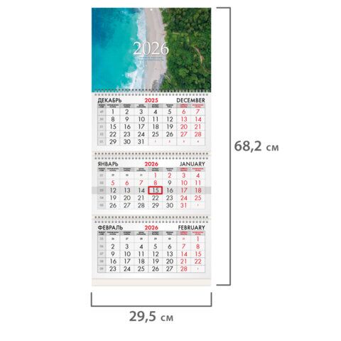 Квартальный календарь BRAUBERG "Побережье" предназначен для делового планирования. Офисный календарь на 2026 год на 3 гребнях. Состоит из 3 блоков с календарными сетками на три месяца – предыдущий, текущий и последующий. Блок календаря напечатан на офсетн