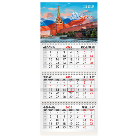 Квартальный календарь BRAUBERG "Сердце России" предназначен для делового планирования. Офисный календарь на 2026 год на 3 гребнях. Для удобства планирования состоит из 3 блоков с календарными сетками на три месяца – предыдущий, текущий и следующий.
