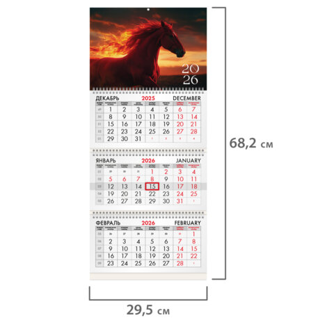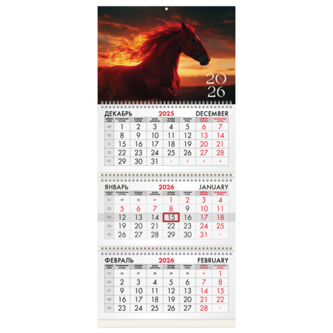Квартальный календарь BRAUBERG "Символ года" предназначен для делового планирования. Офисный календарь на 2026 год на 3 гребнях. Состоит из 3 блоков с календарными сетками на три месяца – предыдущий, текущий и последующий. Блок календаря напечатан на офсе