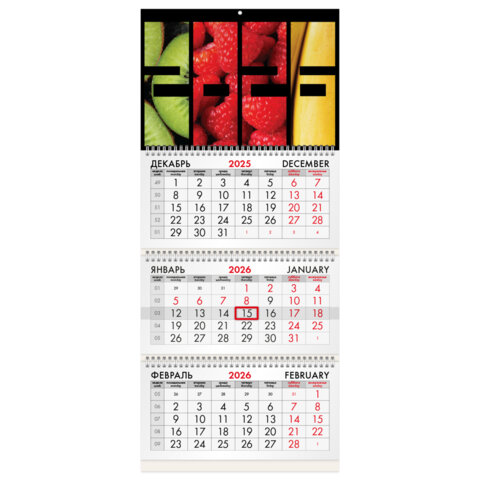 Квартальный календарь BRAUBERG "Фрукты" предназначен для делового планирования. Офисный календарь на 2026 год на 3 гребнях. Состоит из 3 блоков с календарными сетками на три месяца – предыдущий, текущий и последующий. Блок календаря напечатан на офсетной