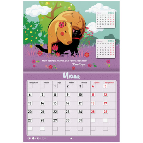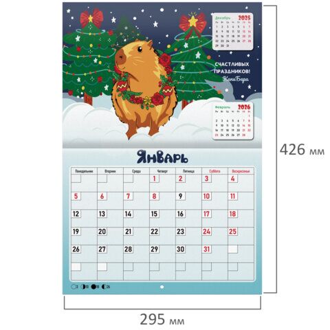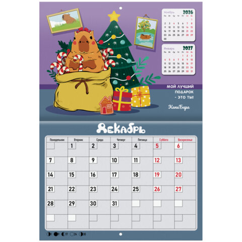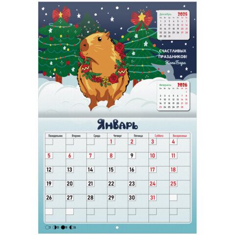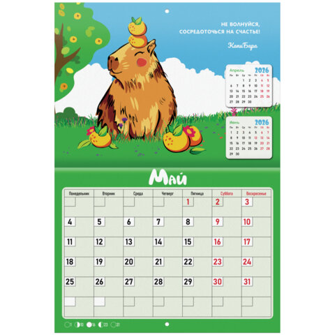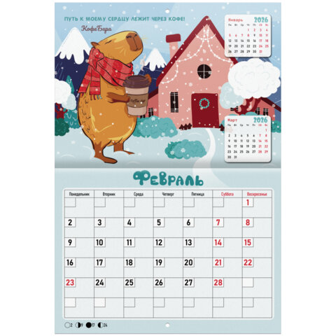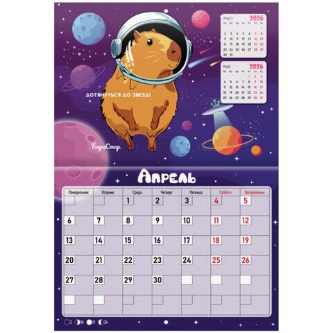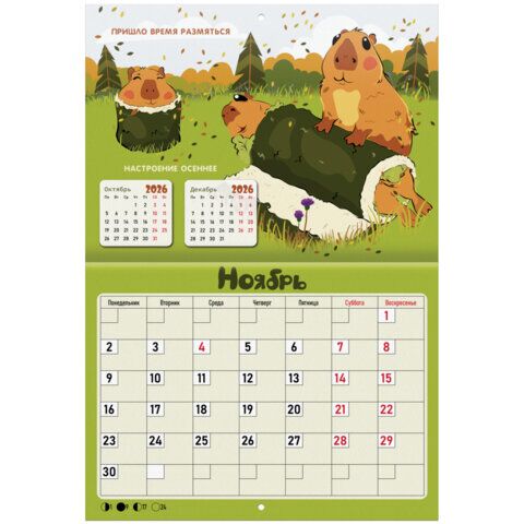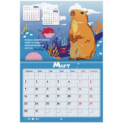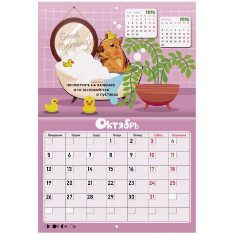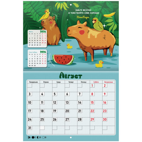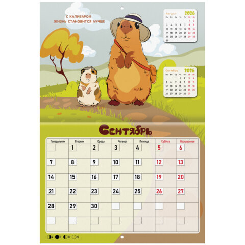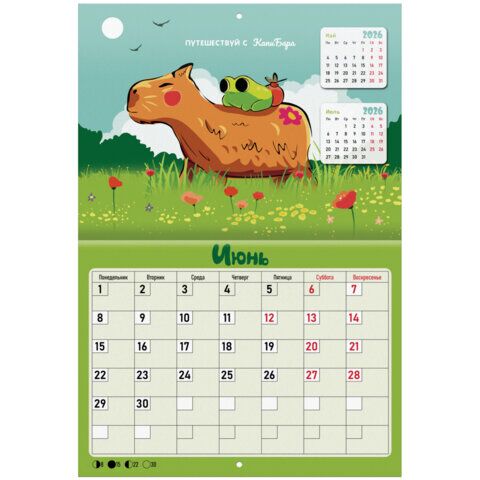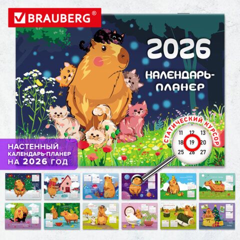 Календарь-планер настенный перекидной на 2026 г., BRAUBERG, 12 листов, 29,5х21,3 см, "Капибара", 169883, купить в Грант СПБ
