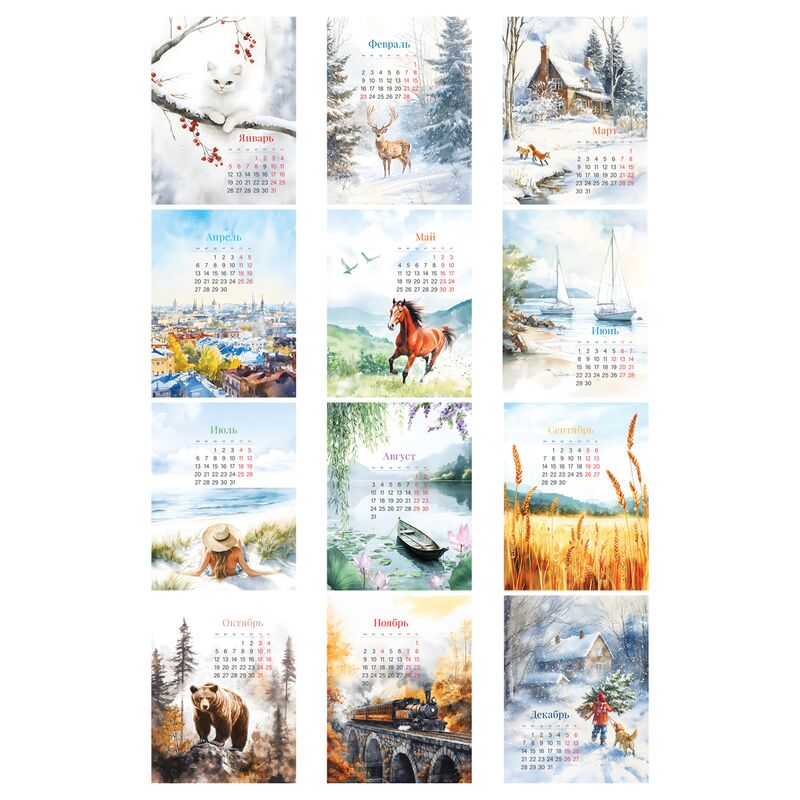 Календарь настольный перекидной BG «Счастье в каждой минуте» на 2026 год – отличный помощник для офиса. Размер горизонтального календаря – 108*140 мм, тип скрепления – гребень/спираль. Календарь имеет подложку с рисунком и 7 листов. Календарный блок изгот