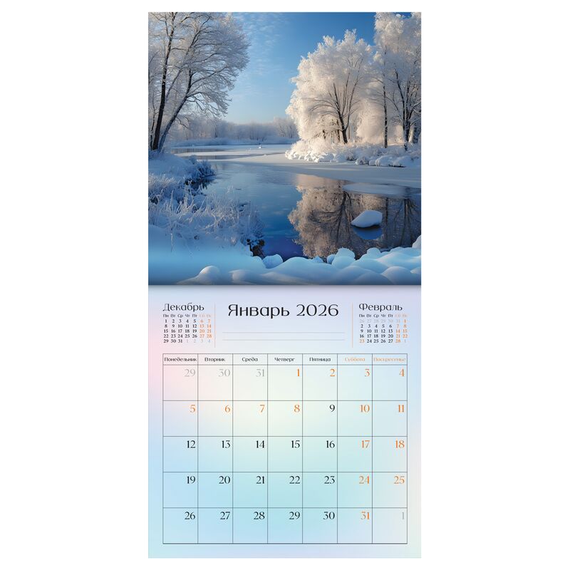 Настенный перекидной календарь на скрепке BG "Краски природы" на 2026 год — это идеальное сочетание функциональности и эстетики, которое преобразит интерьер. Размер — 29*29 см. Изготовлен из мелованной бумаги плотностью 105 г\м2 с полноцветной печатью.