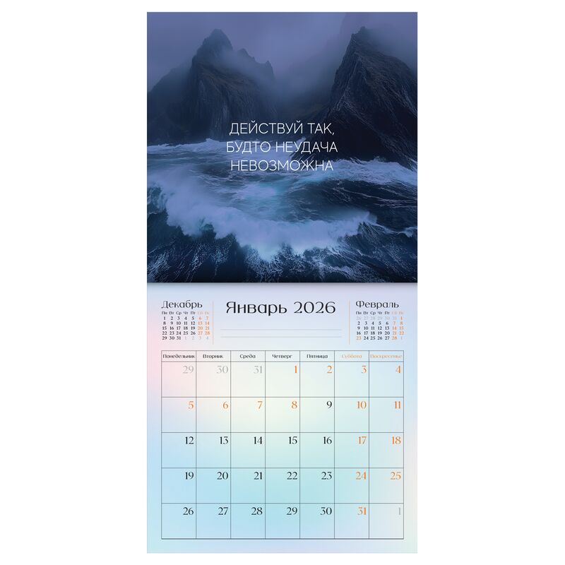 Настенный перекидной календарь на скрепке BG "Мотивационный" на 2026 год — это идеальное сочетание функциональности и эстетики, которое преобразит интерьер. Размер — 29*29 см. Изготовлен из мелованной бумаги плотностью 105 г\м2 с полноцветной печатью.