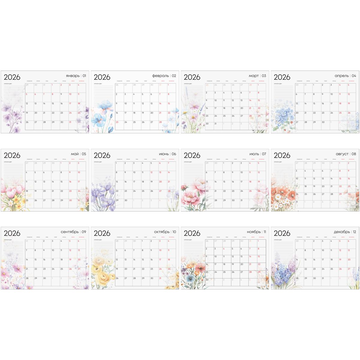 Настенный календарь-планер на гребне BG «Цветы» на 2026 год подходит для ежедневных записей и помогает эффективно распоряжаться временем. Формат — А3. На страницах размером 420*297 мм помещаются все необходимые блоки для успешного планирования: расписание
