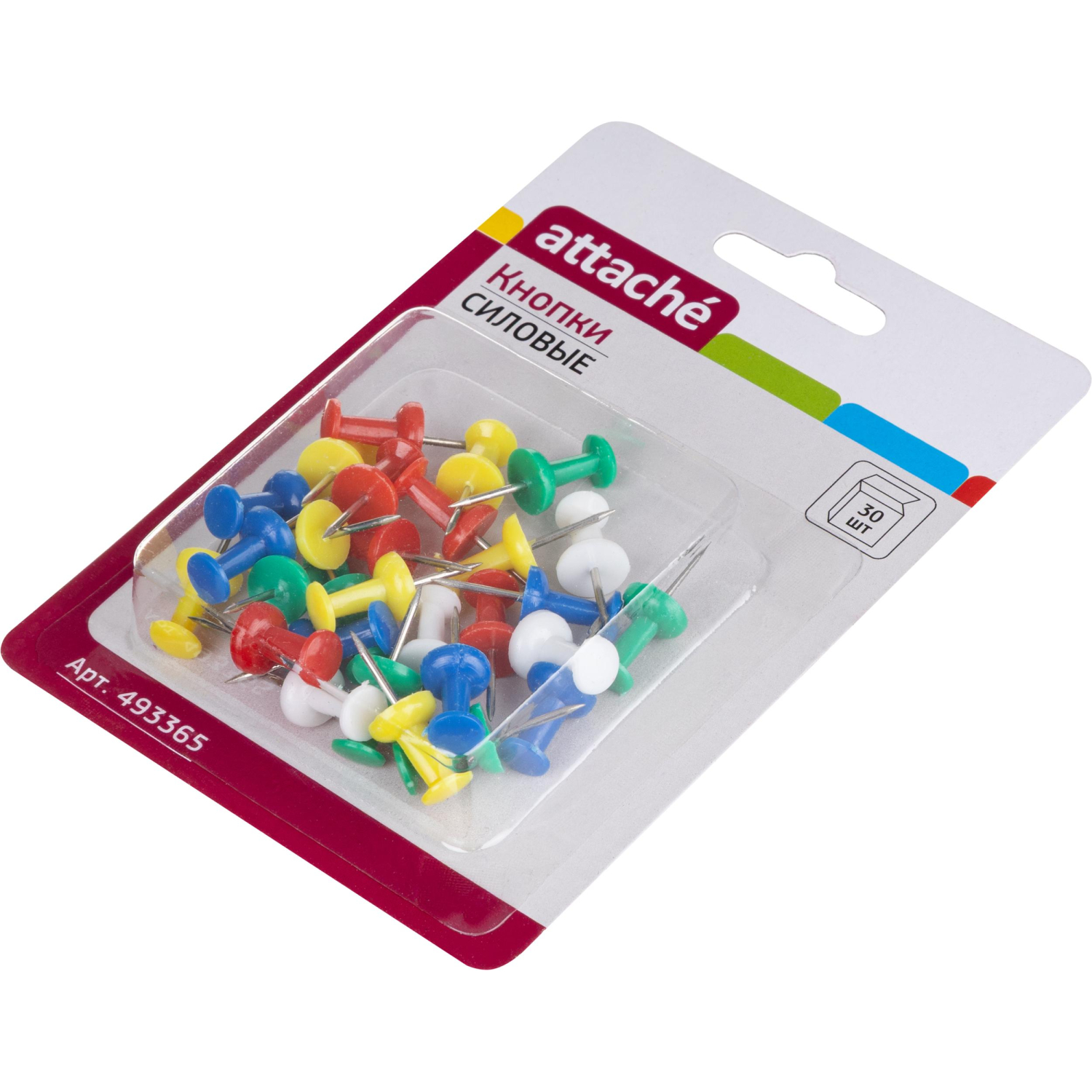 Кнопки силовые пяти разных цветов - красного, желтого, зеленого, синего и белого, поставляются комплектом. Изготовлены из пластика. Длина иглы 11 мм. Пластиковые насадки имеют цилиндрическую форму. Рабочая поверхность силовой кнопки изготовлена из металла. Силовые кнопки используются для крепления информации к доскам пробкового типа, для планирования и отметок. Поставляются в блистерной упаковке по 30 штук.
