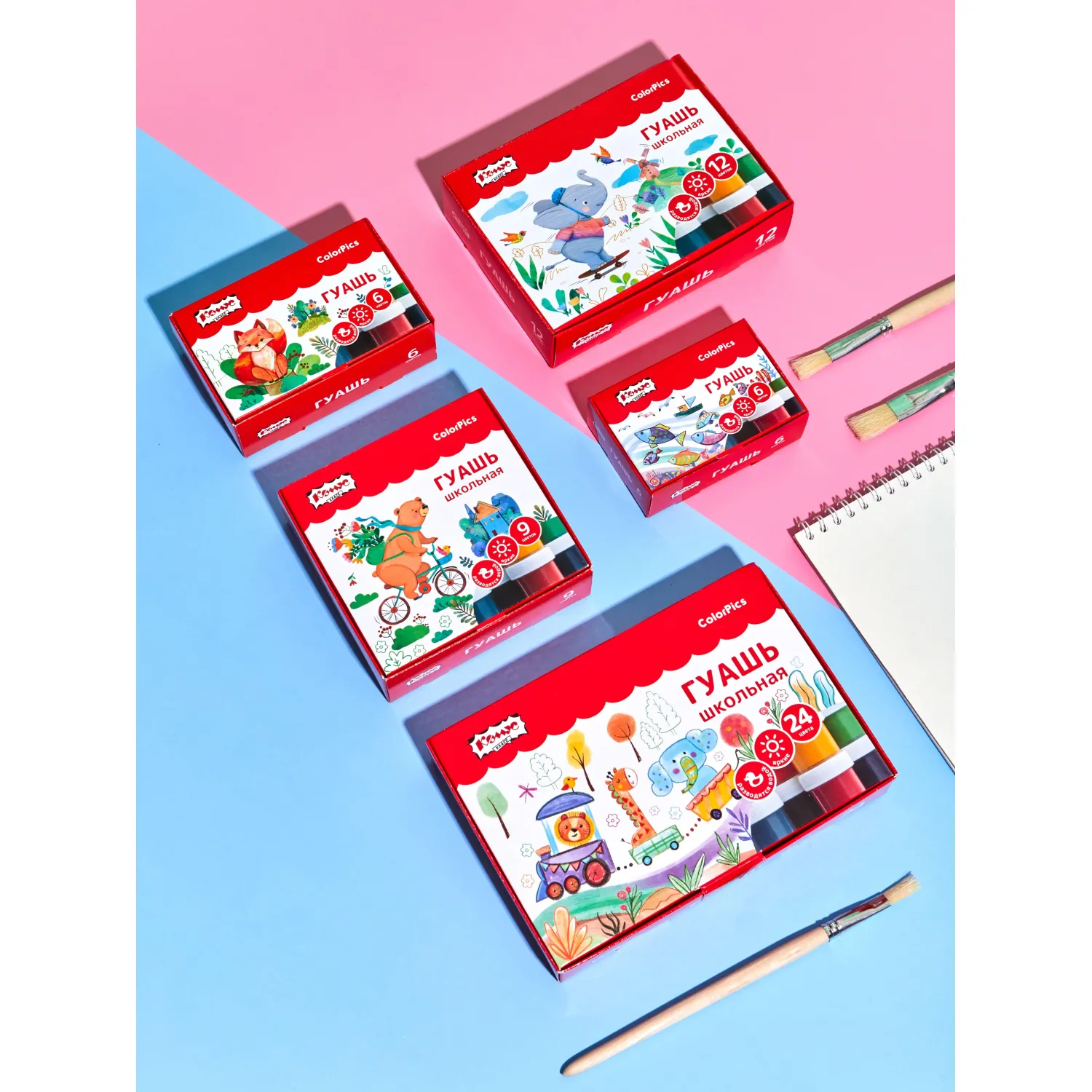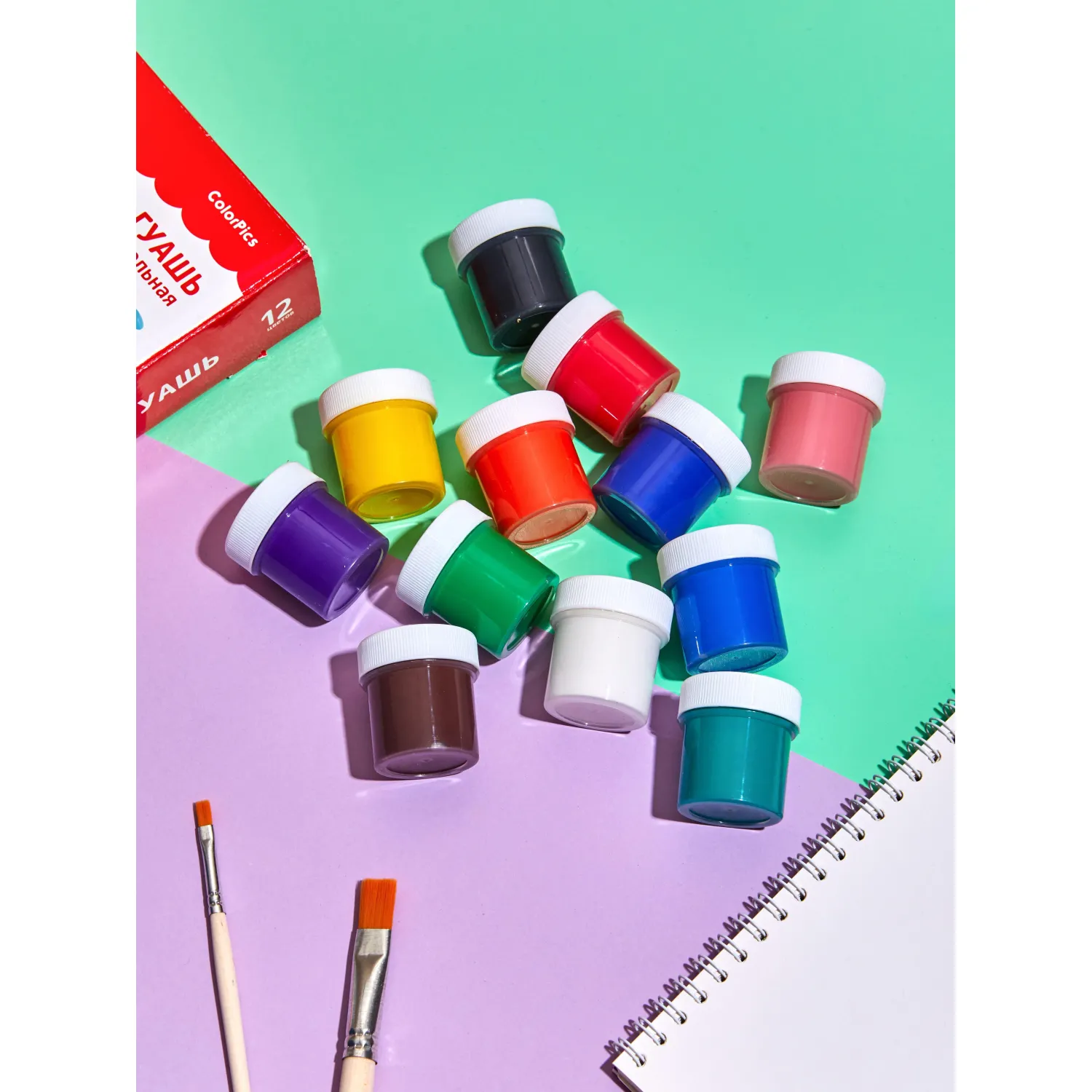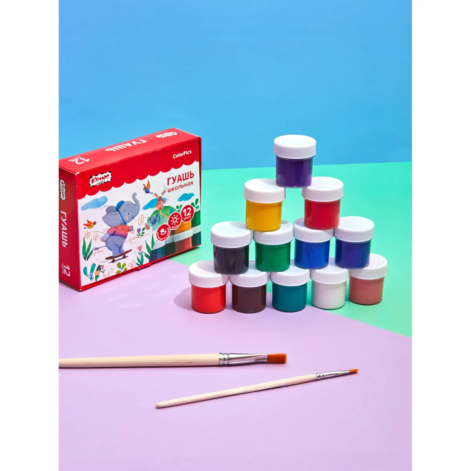 Гуашь №1 School ColorPics 12 цветов по 20 мл, предназначена для детского творчества, выполнения художественно-декоративных, оформительских работ. Предназначена для детей старше 3-х лет. Краски изготовлены на основе натуральных компонентов и высококачественных пигментов. Обладают хорошей кроющей способностью, яркими цветами. Гуашь находится в пластиковых, герметичных баночках с завинчивающейся крышкой. В набор входит 12 цветов: белый, красный, синий, черный, желтый, зеленый, травянисто-зеленый, коричневый, оранжевый, голубой, фиолетовый, розовый. Краски упакованы в цветную картонную коробку, размер упаковки (ДхШхВ), мм 153x115x40. Поставляется без кисти. В рамках ребрендинга производится перевод данного артикула с ТМ №1School на ТМ Комус Класс с сохранением всех потребительских характеристик товара. На переходный период допускается поставка данной продукции в двух вариантах дизайна.