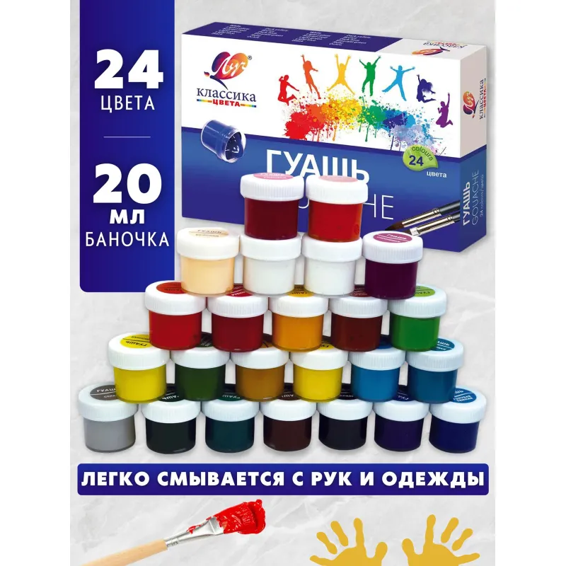 Гуашь 'Луч. Классика' 24 цвета по 20 мл, предназначена для детского творчества, выполнения художественно-декоративных, оформительских работ. Краски изготовлены на основе натуральных компонентов и высококачественных пигментов. Краска находится в пластмассовых герметичных баночках, на крышке есть наклейка, которая указывает на цвет краски в баночке. В набор входит 24 цвета: белила (2 баночки), бирюзовый, красно- коричневый, зеленый темный, сиреневый, розовый, желто-зеленый, голубой, серый, лимонный, оранжевый светлый, бежевый, алый, желтый светлый, зеленый светлый, черный, синий светлый, желтый темный, коричневый, голубой темный, рубиновый, охра, изумрудный. Краски упакованы в цветную картонную коробку, размер упаковки (ДxШxВ): 272x179x40 мм. Объем одной баночки - 20 мл. Поставляется без кисти. Законодательные и технические документы.