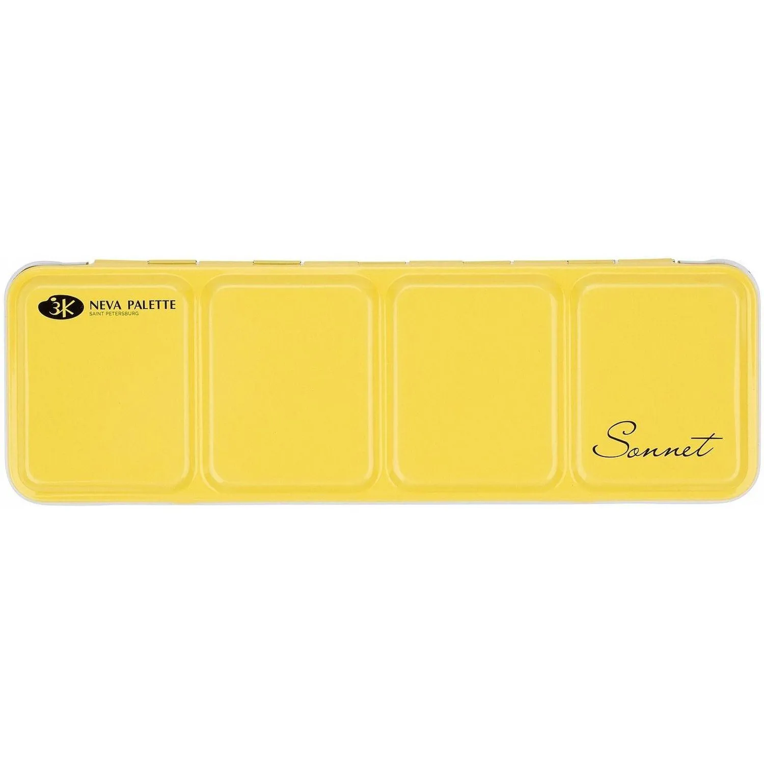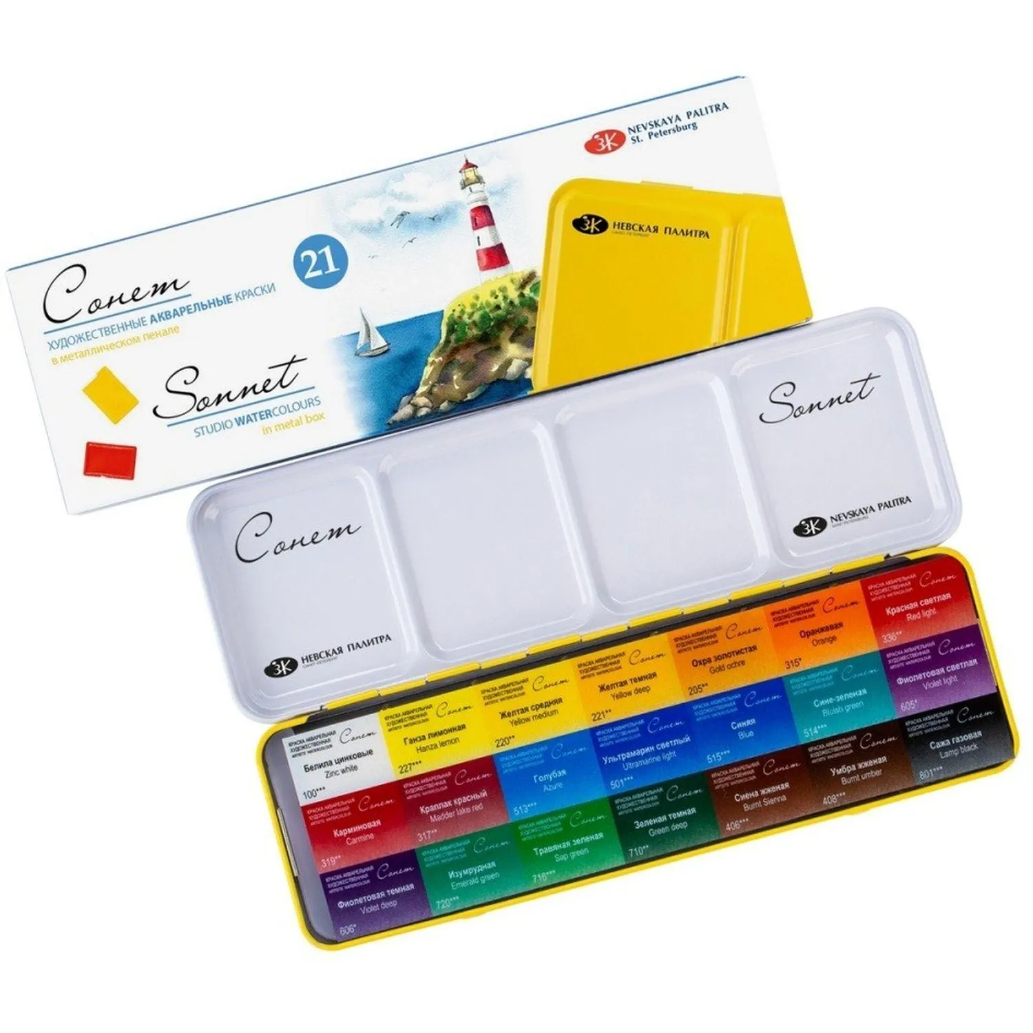 Акварельные краски Сонет разработаны специально для начинающих художников. Изготавливаются на основе современных рецептур. Обладают интенсивностью, прозрачностью и чистотой цвета. Превосходно смешиваются, размываются и берутся на кисть. Цвета в наборе: белила титановые, лимонная, желтая средняя, охра светлая, красная светлая или красная темная, карминовая, зеленая светлая, зеленая ?ФЦ? или зеленая темная, синяя светлая или голубая ?ФЦ?, ультрамарин, умбра жженая, черная.