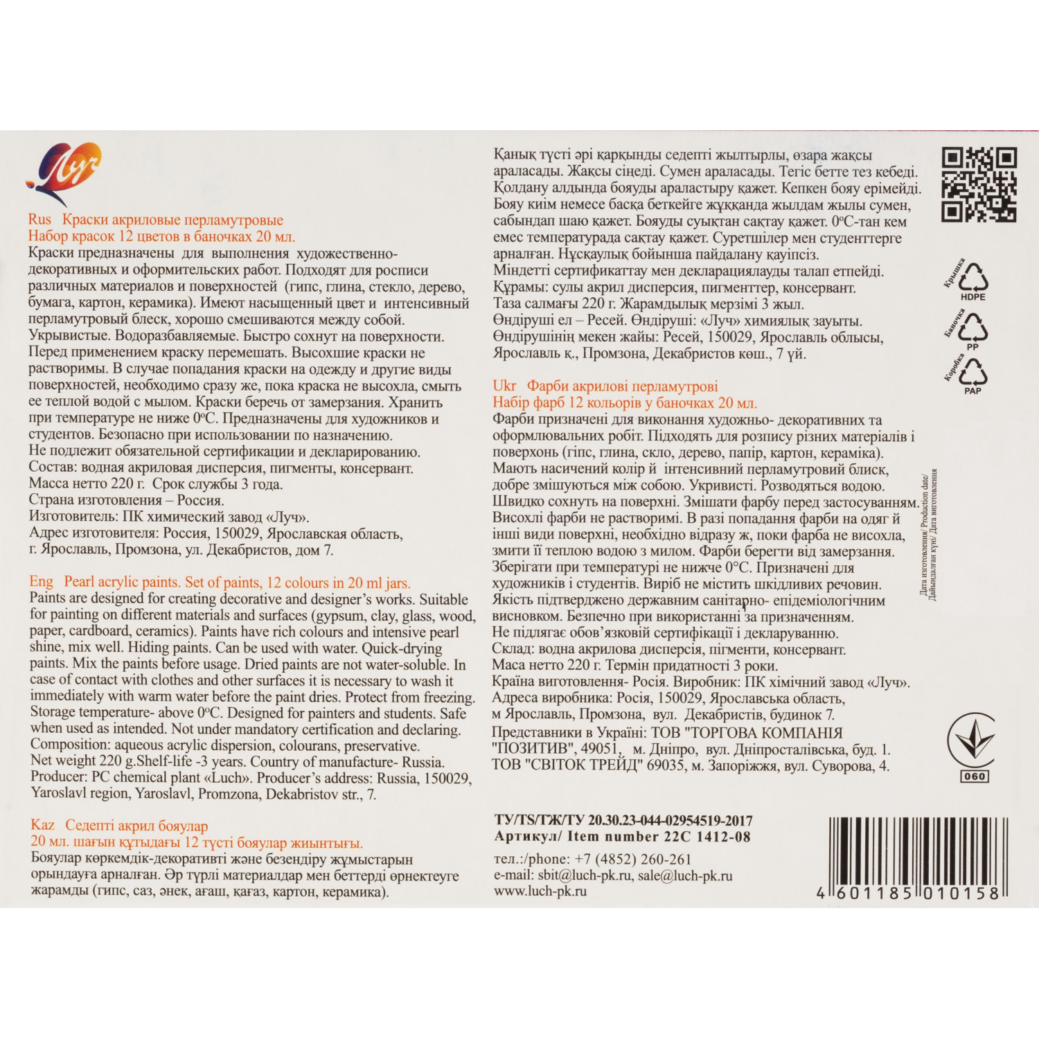 Глянцевые акриловые краски предназначены для художественных, декоративных и дизайнерских работ. Акриловые краски, как и акварельные, легко разбавляются водой, но после высыхания их уже нельзя размочить, образуют несмываемую пленку. Красочный слой эластичен, прочен и долговечен. Красками можно работать практически на любой поверхности. 12 цветов - лимонный перламутровый, розовый перламутровый, красный перламутровый, голубой перламутровый, изумрудный перламутровый, черный перламутровый, белый перламутровый, фиолетовый перламутровый, оранжевый перламутровый, коричневый перламутровый, сиреневый перламутровый, зеленый перл Законодательные и технические документы' в раздел Описание КТ ИМК по артикулам во вложенном файле.