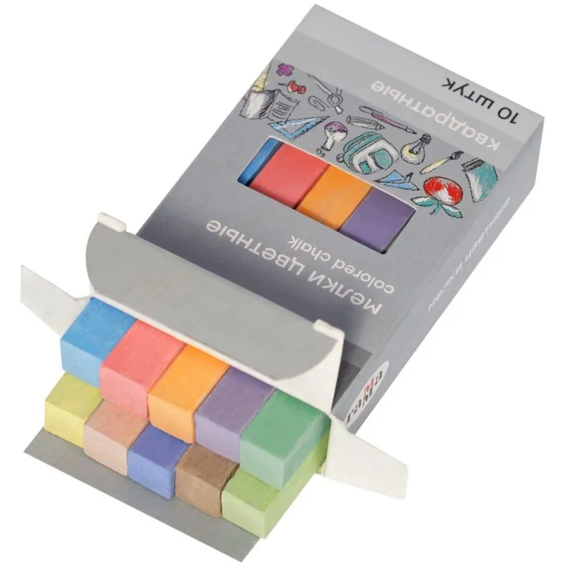 Мягкий школьный мел подходит для письма и рисования на школьной доске или любой шероховатой поверхности. Мел удобно лежит в руке, не царапает рабочую поверхность и не создает пыль. Продукт на 95% состоит из чистого мела, не содержит гипс. Экономично расходуется - одного набора хватает надолго. Набор: 10 цветных мелков квадратной формы. Длина мелка - 8 см.