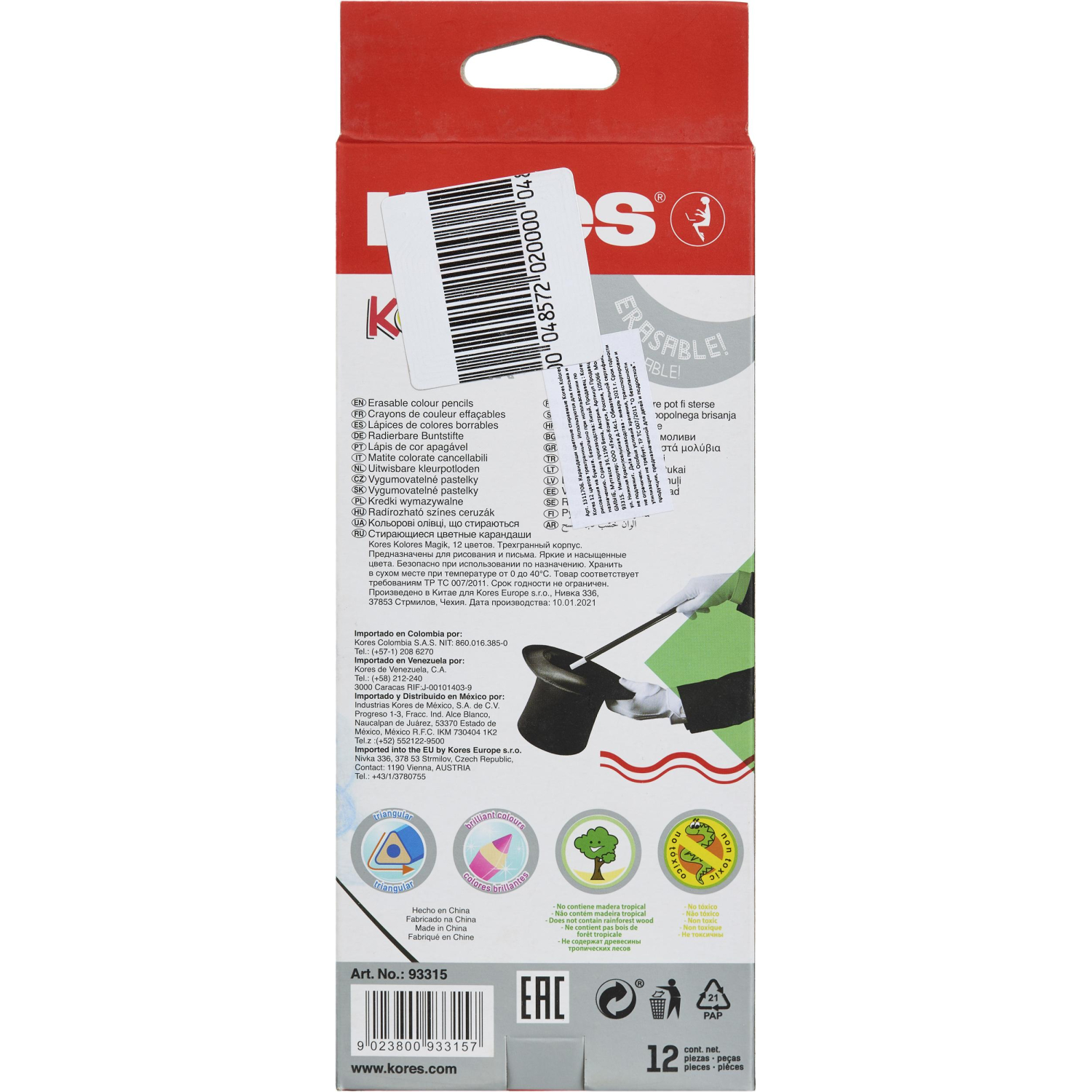 Карандаши Kolores MagiK цветные стираемые, заточенные, для рисования, письма и раскрашивания на бумаге. Идеально подходят для детей и студентов, а также взрослых, которым нравится заниматься творчеством. 12 ярких и насыщенных цветов. Изготовлены из качественной древесины, ударопрочные и легко затачиваются, не оставляя заусенцев. Форма карандаша трехгранная, что позволяет правильно располагать пальцы, держать карандаш "щепоткой". Карандаши легко стираются ластиком, входящим в набор, что позволяет изменить и подкорректировать рисунок. Длина корпуса карандаша 175 мм. Диаметр грифеля 3 мм. Поставляется в картонной упаковке 88x13x224 мм с подвесом. Безопасны при использовании по назначению.