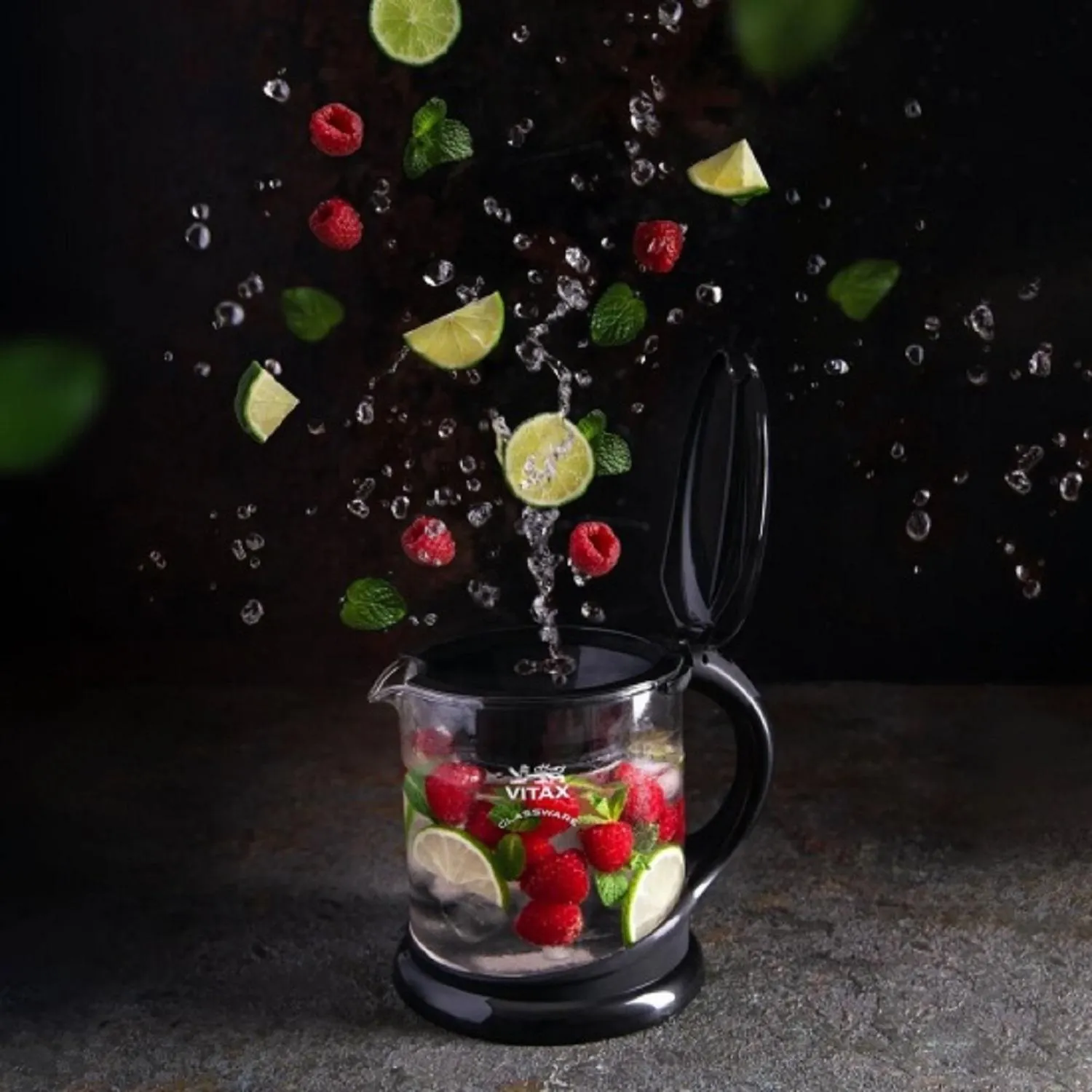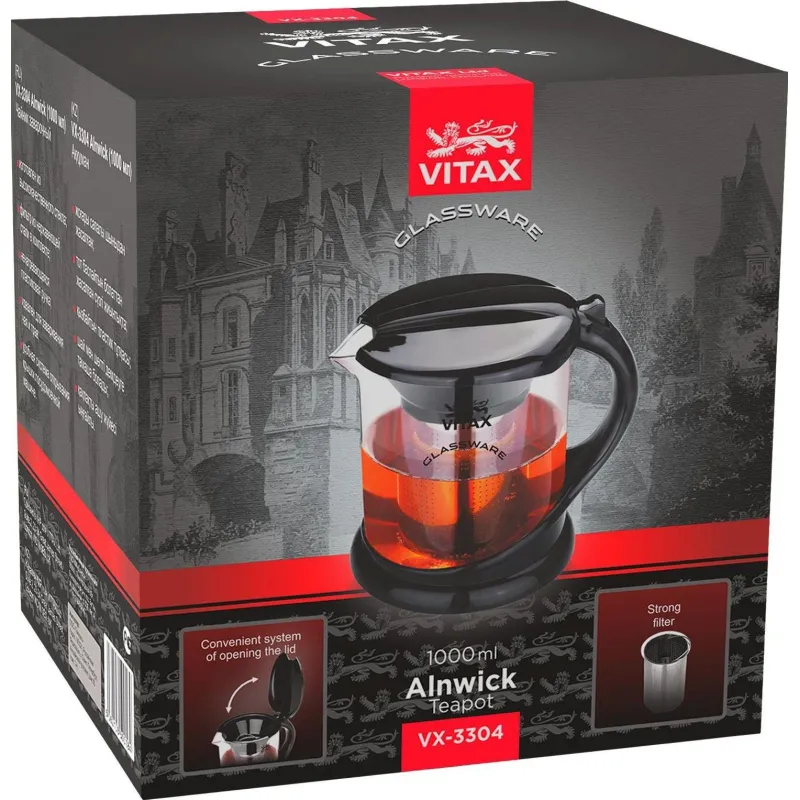 Чайник заварочный Vitax Alnwick VX-3304 стеклянный/пластиковый 1 л. Заварочный чайник Vitax изготовлен из высококачественного боросиликатного термостойкого стекла, контейнер-фильтр из пищевой нержавеющей стали 18/10. Не нагревающаяся пластиковая ручка. Удобная система открывания крышки для быстрого извлечения фильтра. Подходит для мытья в посудомоечной машине. Объем 1000 мл.