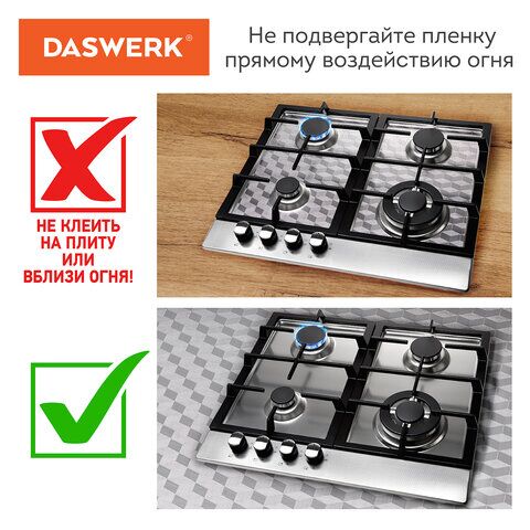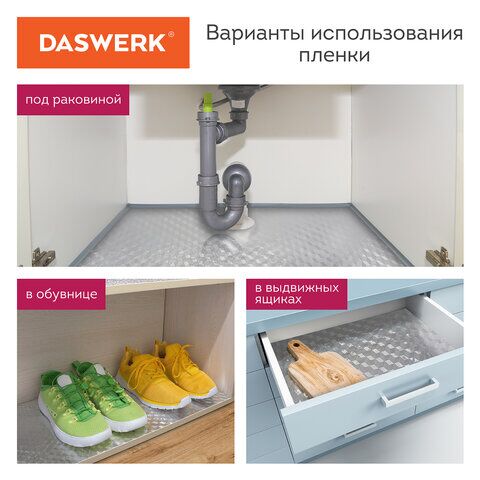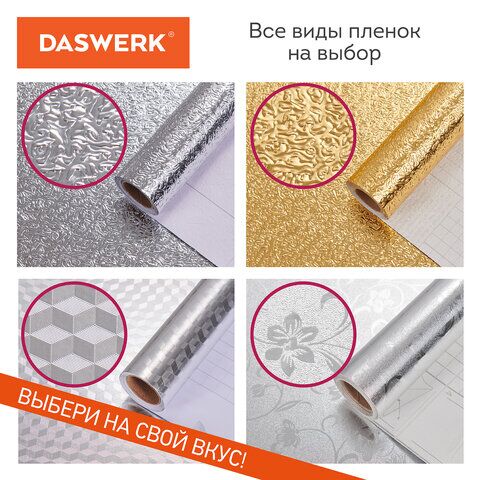 Самоклеящаяся плёнка DASWERK из прочного композитного материала с содержанием алюминия не впитывает воду, масла, жиры и эффективно используется в качестве защитного покрытия для кухонных и рабочих поверхностей – дома, на даче, в мастерской и даже в офисе.Хозяйственная самоклеящаяся плёнка DASWERK поставляется в рулонах шириной 60 см и длиной 3 м, полотна такого размера хватает, чтобы оклеить поверхность площадью 1,8 м2 – столешницу, кухонную рабочую зону, выдвижные или навесные полки, пространство под раковиной на кухне, подоконники, детские столики и даже стены. Благодаря слою акрилового клея фольгированная плёнка легко наклеивается на любую гладкую и чистую поверхность, а разметка на обратной стороне облегчает нарезание плёнки на фрагменты требуемой формы и размера.