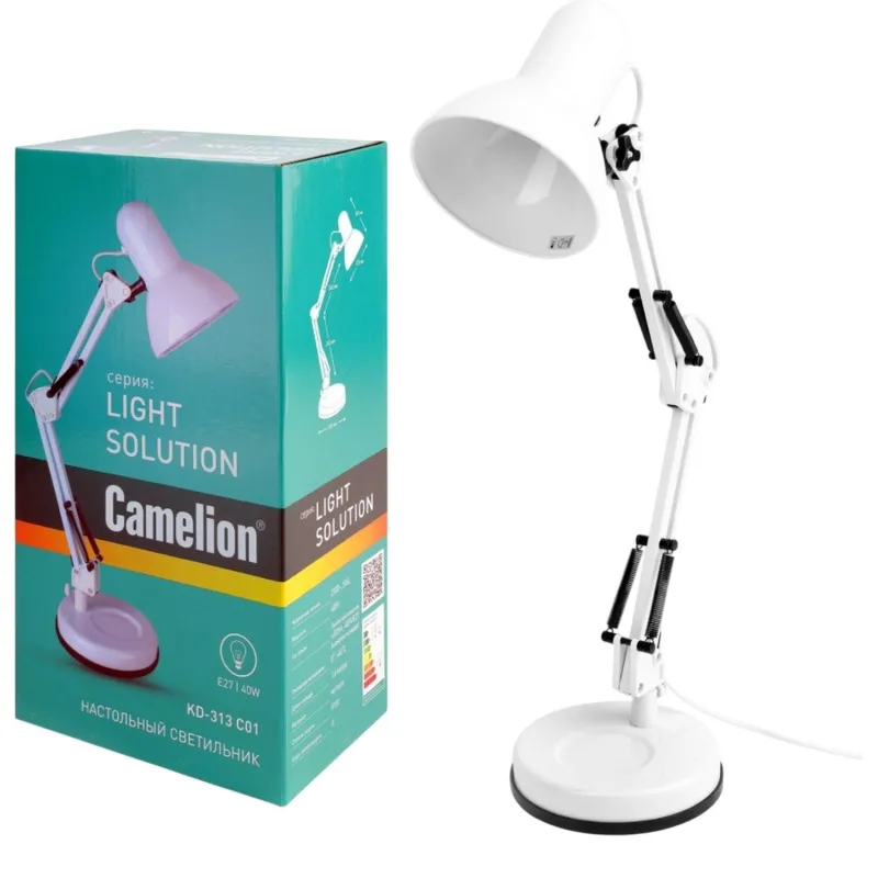 Настольный светильник Camelion KD-313 предназначен для освещения рабочего пространства на письменном столе, создания комфортных условий на рабочем месте. Имеет интересный дизайн. В качестве источника освещения для этого могут использоваться: стандартные лампы накаливания или миньон, галогенные лампы накаливания, компактные энергосберегающие люминесцентные лампы. Лампа в комплект не входит.