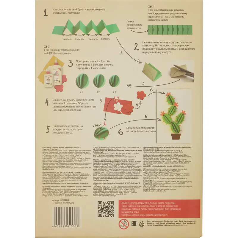 16 листов (8 цветов) цветной бумаги из качественно прокрашенной офсетной бумаги плотностью 70г/кв.м. Набор упакован в папку из высококачественного мелованного картона плотностью 200г/кв.м. Размер А4 формата - 210x297 мм. Транспортная упаковка - гофрокороб.