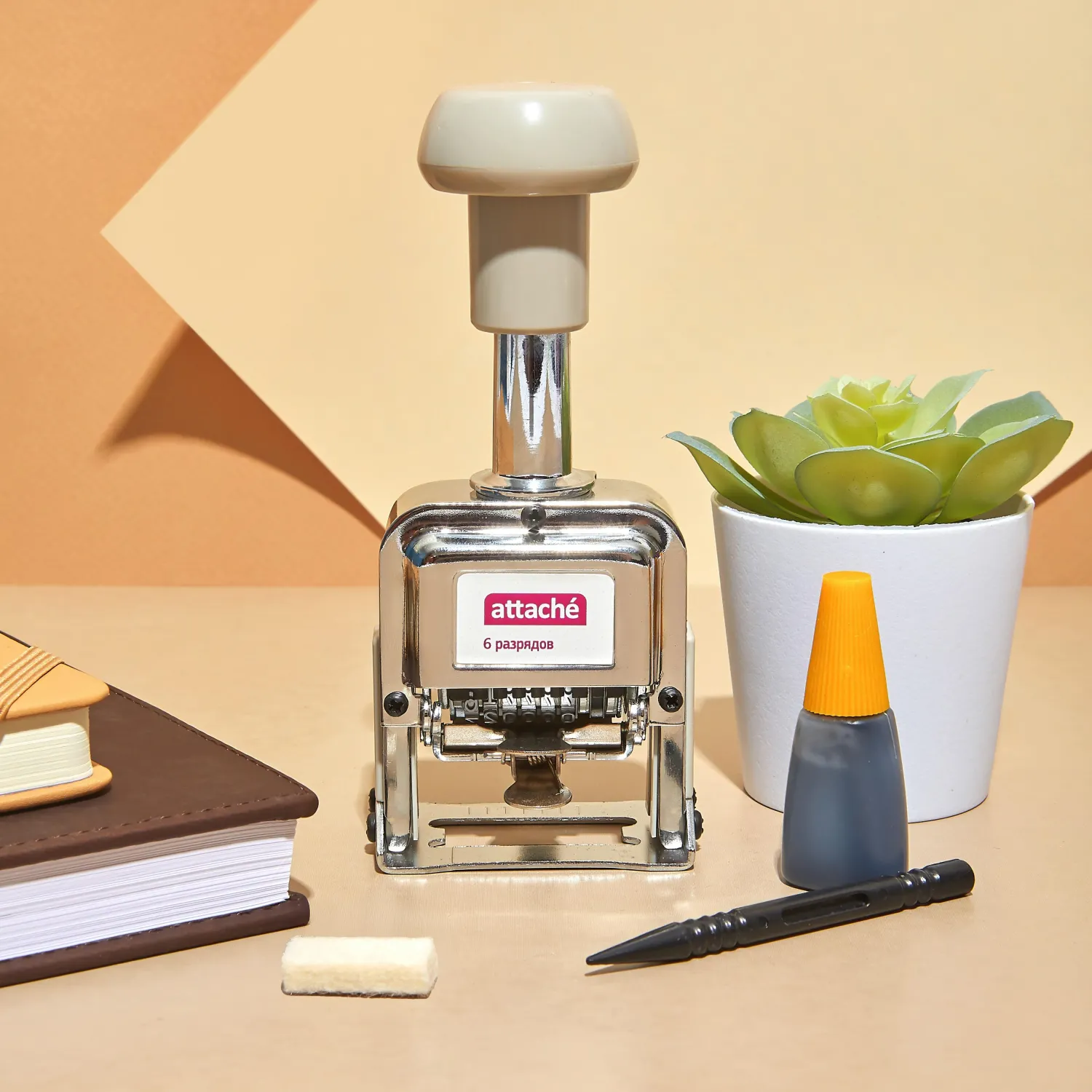 Нумератор автоматический Attache 6-и разрядный, размер шрифта 4,8 мм. Металлический корпус. При нажатии на ручку нумератора на бумаге появляется оттиск с номером. При повторном нажатии номер автоматически увеличивается на единицу. Комплектация: штемпельная подушка, черная краска на масляной основе, нумератор может быть зафиксирован на 2,3,4,6 и 12 нажатий прежде чем он провернется на 1 цифру далее. Возможно обнулять и откатывать назад нумерацию. Сменная подушка артикул 892698. Внимание! Возможно использование красок только на спиртовой и масляных основах. Обычные штемпельные краски на металле скатывается, и оттиск получается размазанным. Краски на масляных и спиртовых основах пропитывают тонкую бумагу насквозь.