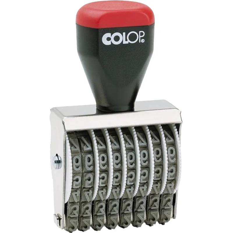 8-ми разрядный. Удобная рукоятка, металлический корпус. Для получения оттиска предварительно окрашиваются при помощи настольной штемпельной подушки. Используются для нумерации документов, проставления артикулов на товарах. Номер устанавливается вручную с помощью колесиков. Оттиск однострочный. Высота шрифта - 5 мм. Ширина шрифта - 2 мм.