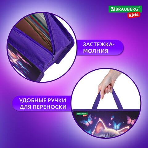 Папка на молнии с ручками BRAUBERG KIDS "Curious cat" предназначена для транспортировки и хранения канцелярских принадлежностей и учебных пособий. Папка защитит содержимое от замятий и повреждений. Идеально подходит для внешкольных занятий. Папка-сумка с