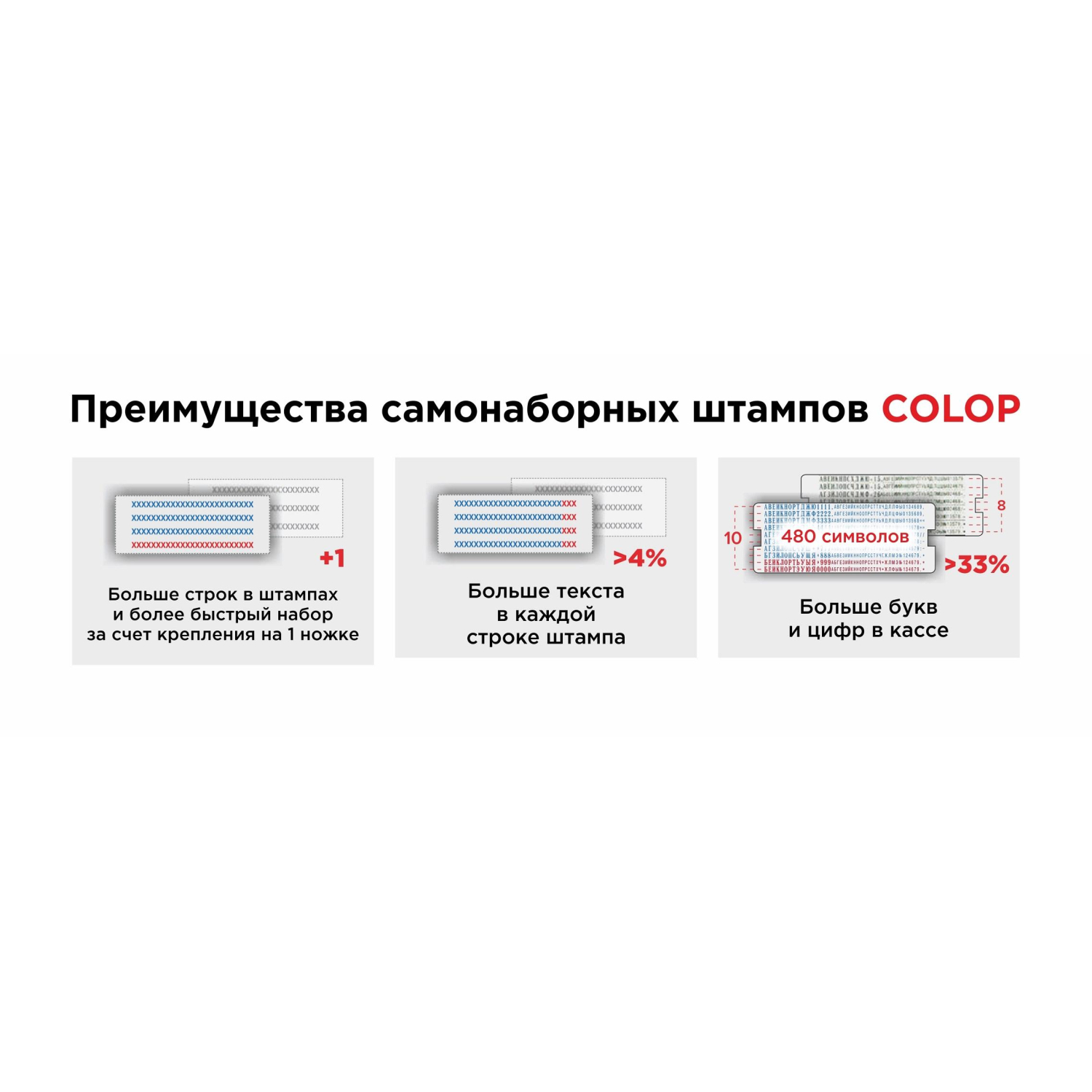 — Экспресс-набор текста — в 1,5 раза быстрее за счет крепления на 1 ножку! Символы крепятся прочно и оперативно в пазы рифленой пластины, количество которых равно количеству строк.