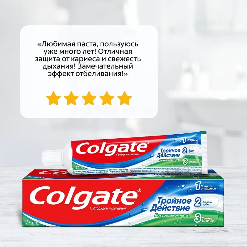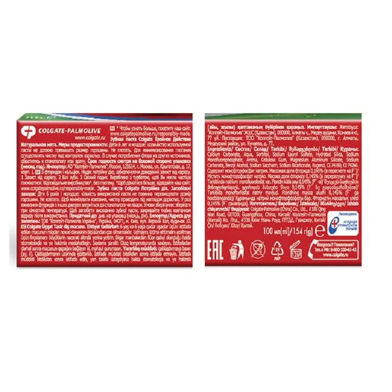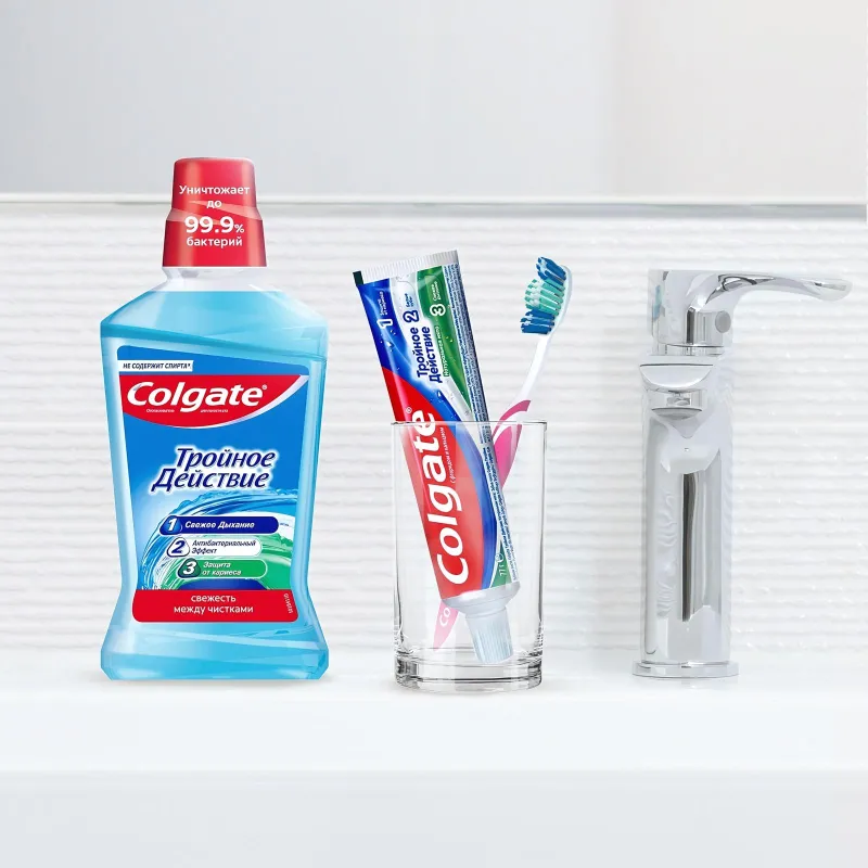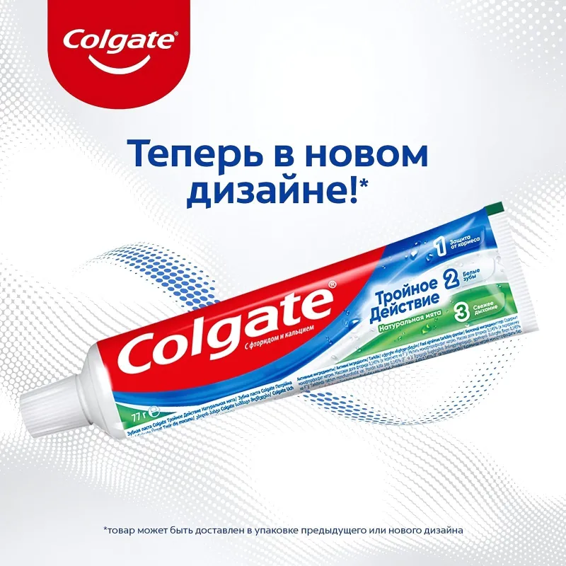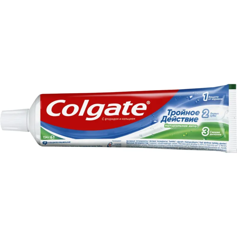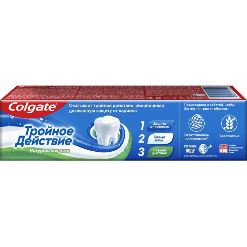 Зубная паста Colgate Тройное Действие обеспечивает максимальную защиту от кариеса. Эта трехцветная зубная паста оказывает тройное действие: помогает защищать зубы от кариеса, помогает удалять потемнения с поверхности зубов и освежает дыхание. Что немаловажно, Colgate Тройное Действие обладает приятным мятным вкусом! Одобрено Стоматологической Ассоциацией России. Детям до 6 лет рекомендуется использовать количество зубной пасты размером с горошину под присмотром взрослых. Не глотать. Небольшое количество пасты нанесите на зубную щетку. Чистите зубы в течение 2х минут, после чего ополосните рот водой. Улыбнитесь! Не забывайте чистить зубы дважды в день и менять зубную щетку каждые 3 месяца. Состав: Calcium Carbonate, Aqua, Sorbitol, Sodium Lauryl Sulfate, Hydrated Silica, Sodium Monofluorophosphate, Aroma, Cellulose Gum, Magnesium Aluminum Silicate, Sodium Carbonate, Benzyl Alcohol, Sodium Saccharin, Sodium Bicarbonate, Limonene, Eugenol, Cl 74260, Cl 74160.