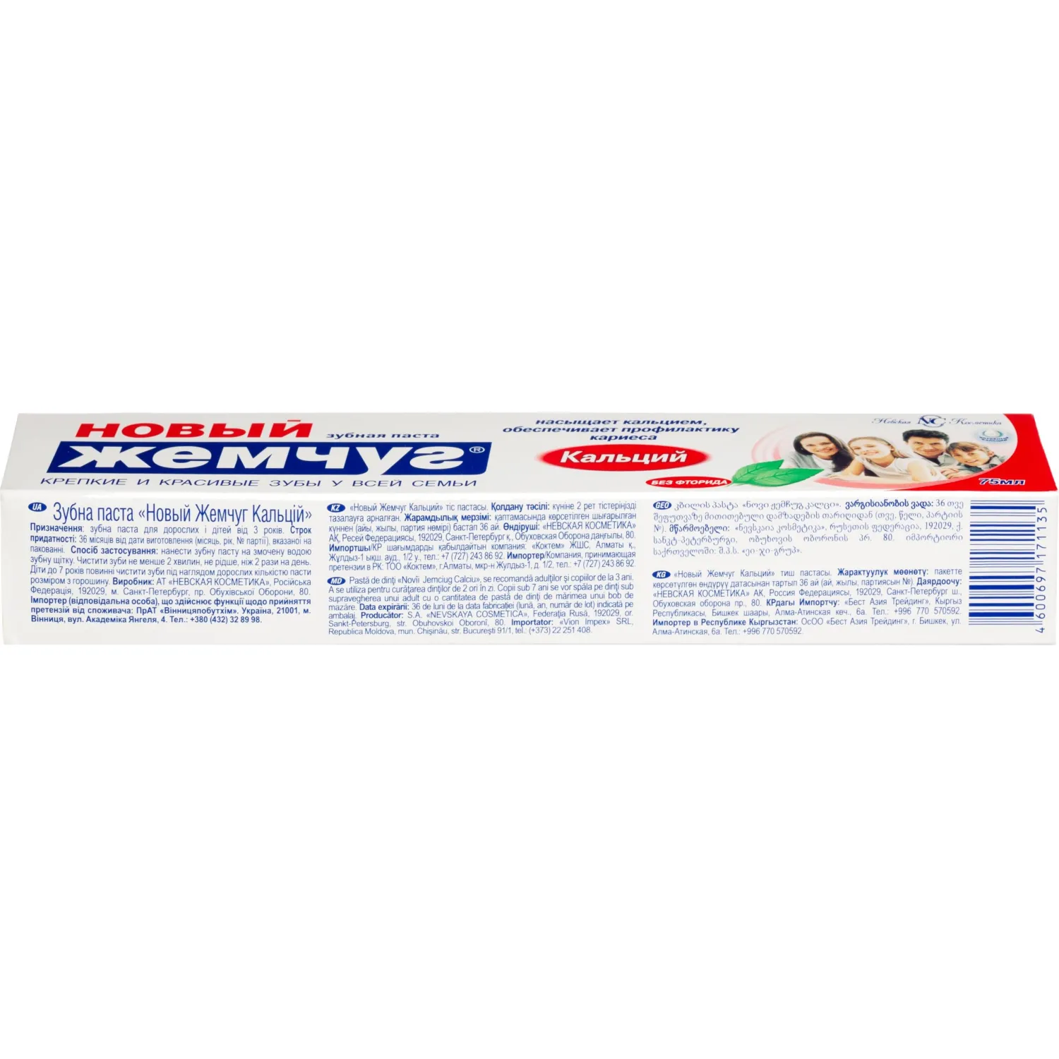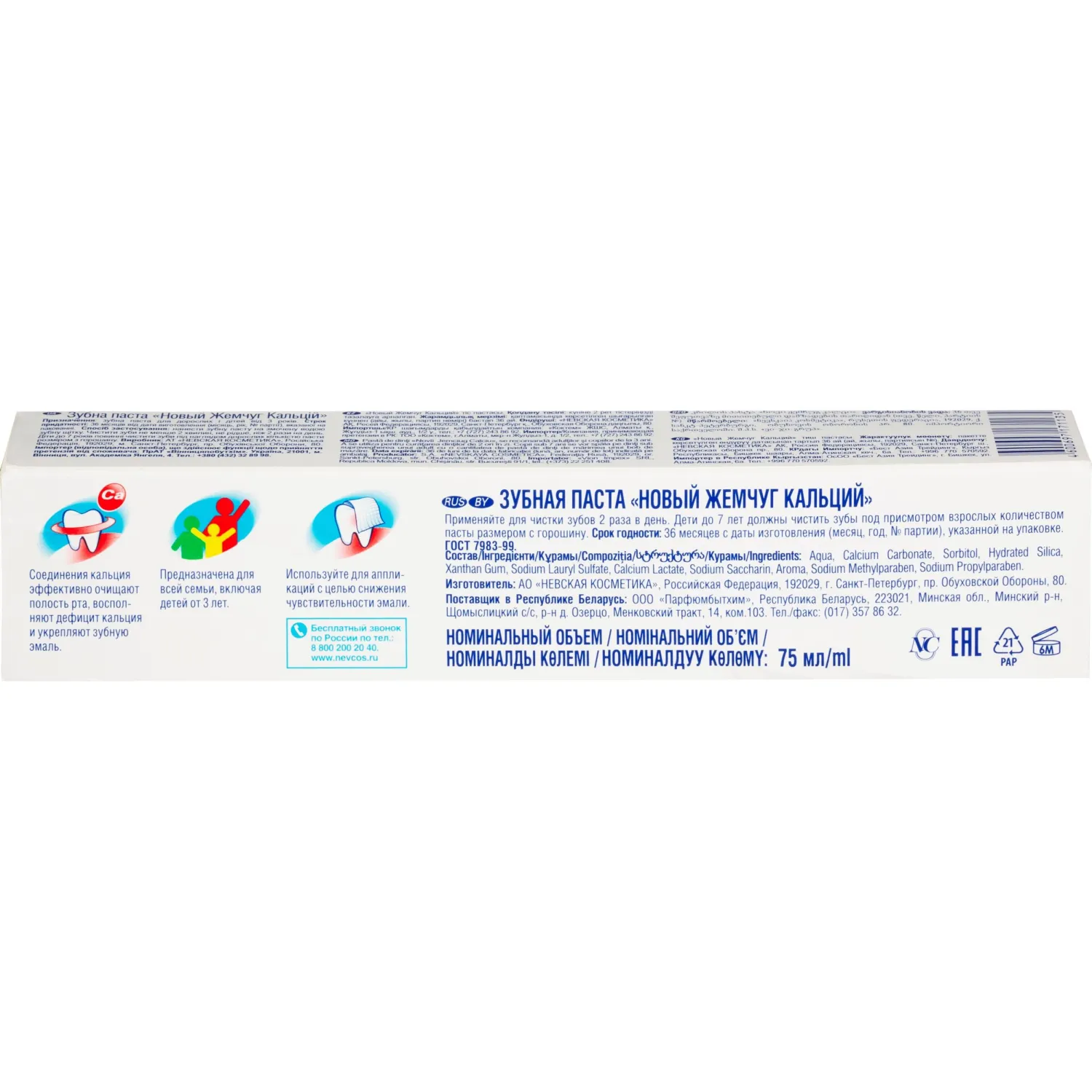 Зубная паста в пластиковом тюбике Новый Жемчуг Кальций - насыщает кальцием и защищает от кариеса. Предназначена для взрослых и детей от 3 лет. Предупреждает развитие кариеса, укрепляет эмаль, восполняет дефицит кальция в твердых тканях полости рта. Рекомендуется так же использовать Новый Жемчуг Кальций для аппликаций с целью снижения гиперчувствительности эмали к температурному воздействию. Цитрат кальция восполняет дефицит кальция в составе зубной эмали, оказывая общеукрепляющее действие на зубы и десны. Аромат мяты предает свежесть дыханию и обеспечивает приятное послевкусие. Состав: calcium carbonate, aqua, sorbitol, glycerin, hydrated silica, xanthan gum, sodium lauryl sulfate, calcium lactate, sodium saccharin, aroma, sodium methylparaben, sodium propylparaben