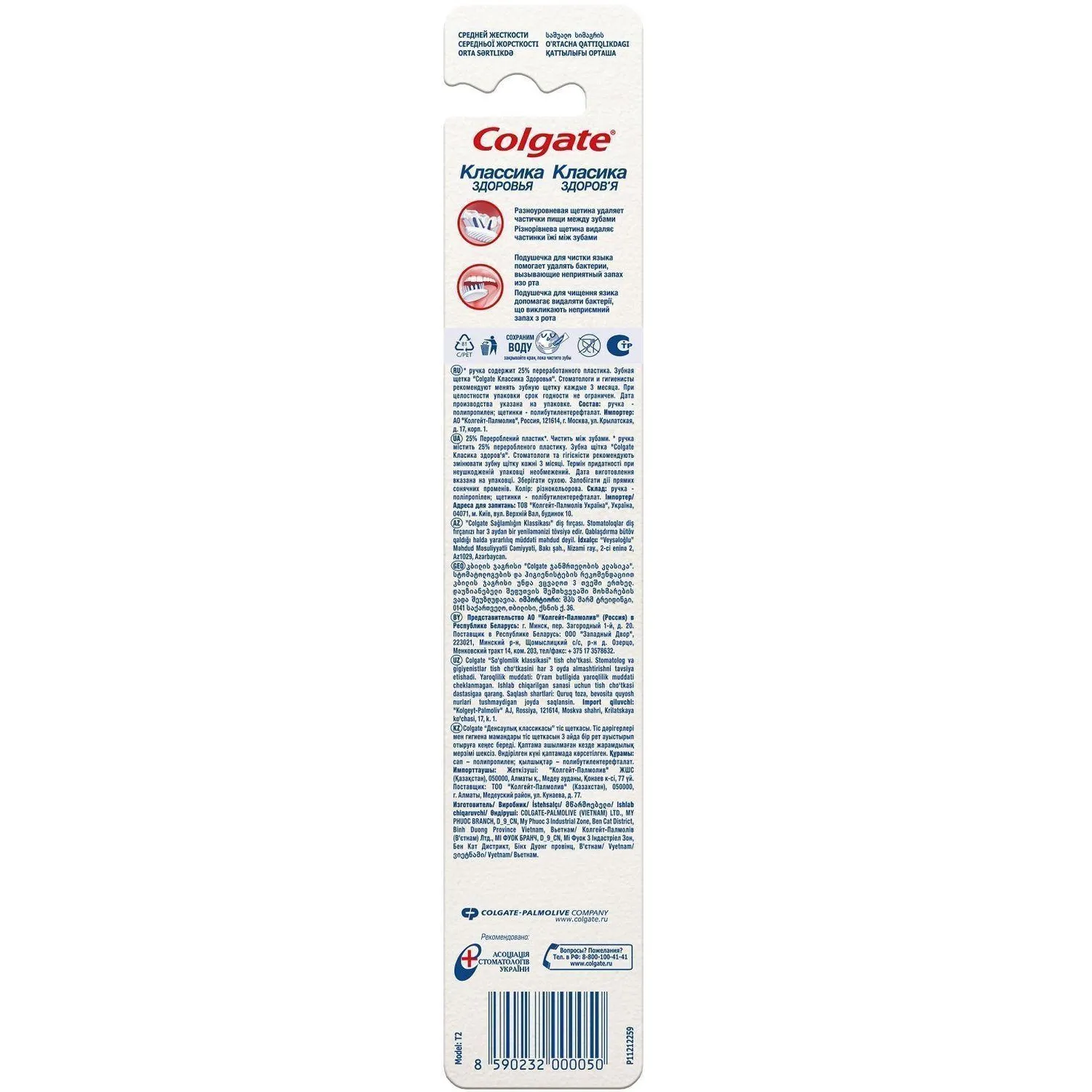Усовершенствованная двухкомпонентная зубная щетка Colgate Классика Здоровья с щетинками V-образной формы глубоко и бережно очищает межзубные промежутки, а подушечка для чистки языка помогает удалять бактерии, вызывающие неприятный запах изо рта. Разноуровневая щетина удаляет частички пищи между зубов, Подушечка для чистки языка помогает удалять бактерии, вызывающие неприятный запах изо рта. Стоматологи и гигиенисты рекомендуют менять зубную щетку каждые 3 месяца. При целостности упаковки срок годности не ограничен.
