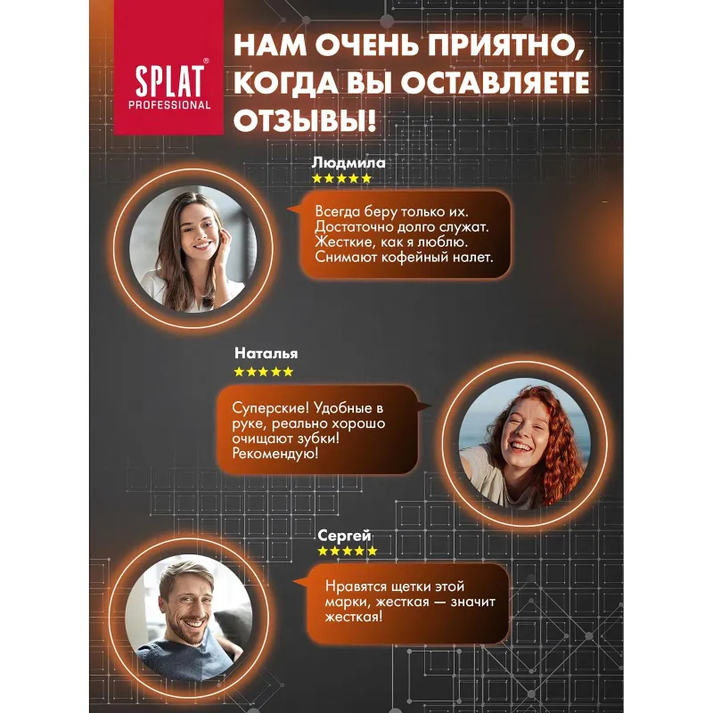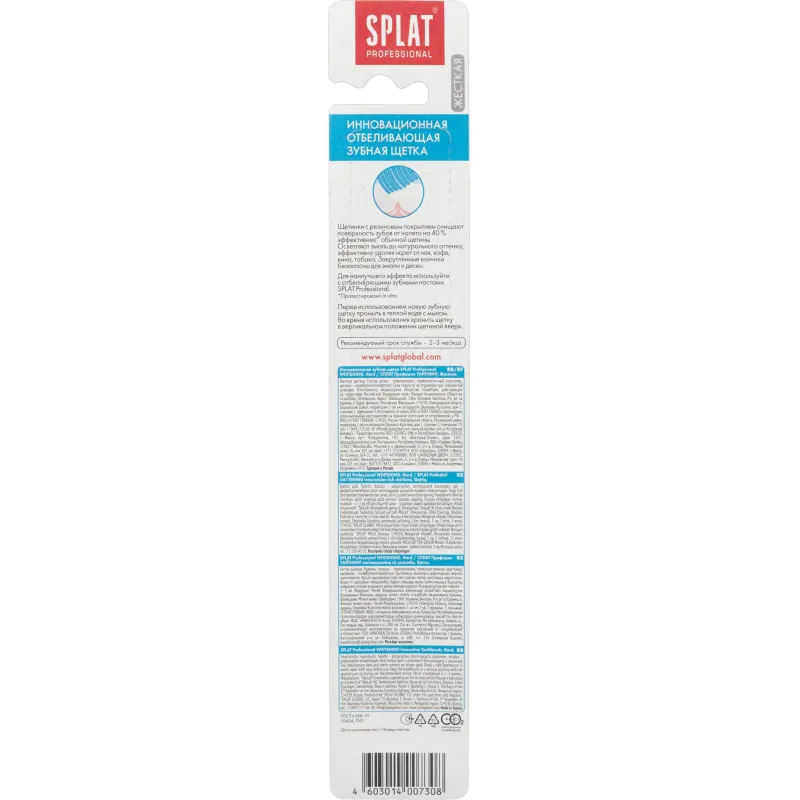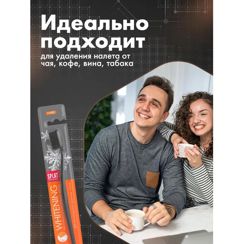 Прорезиненная щетина зубных щеток WHITENING на 40% эффективнее отбеливает зубы, чем обычная нейлоновая, что подтверждено клиническими исследованиями. Специальное покрытие каждой щетинки позволяет аккуратно и эффективно очищать налет, как будто ластик стирает карандаш с белого листа бумаги. Закругленные кончики щетинок гарантируют, что процесс чистки будет безопасным. Зубные щетки SPLAT WHITENING созданы для достижения снежно-белого оттенка зубной эмали, именно поэтому снежинка является символом серии.